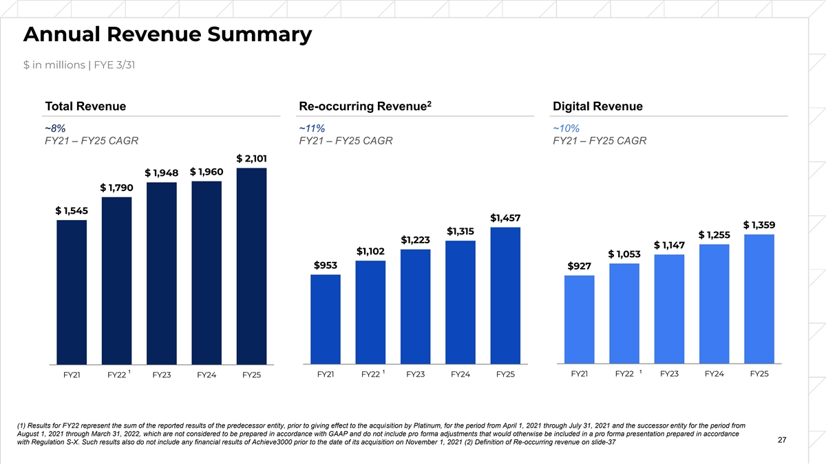 Annual Revenue Summary $ in millions | FYE 3/31 2 Total Revenue Re-occurring Revenue Digital Revenue ~8% ~11% ~10% FY21 – FY25 CAGR FY21 – FY25 CAGR FY21 – FY25 CAGR $ 2,101 $ 1,960 $ 1,948 $ 1,790 $ 1,545 $1,457 $ 1,359 $1,315 $ 1,255 $1,223 $ 1,147 $1,102 $ 1,053 $953 $927 1 1 1 FY21 FY22 FY23 FY24 FY25 FY21 FY22 FY23 FY24 FY25 FY21 FY22 FY23 FY24 FY25 (1) Results for FY22 represent the sum of the reported results of the predecessor entity, prior to giving effect to the acquisition by Platinum, for the period from April 1, 2021 through July 31, 2021 and the successor entity for the period from August 1, 2021 through March 31, 2022, which are not considered to be prepared in accordance with GAAP and do not include pro forma adjustments that would otherwise be included in a pro forma presentation prepared in accordance 27 with Regulation S-X. Such results also do not include any financial results of Achieve3000 prior to the date of its acquisition on November 1, 2021 (2) Definition of Re-occurring revenue on slide-37