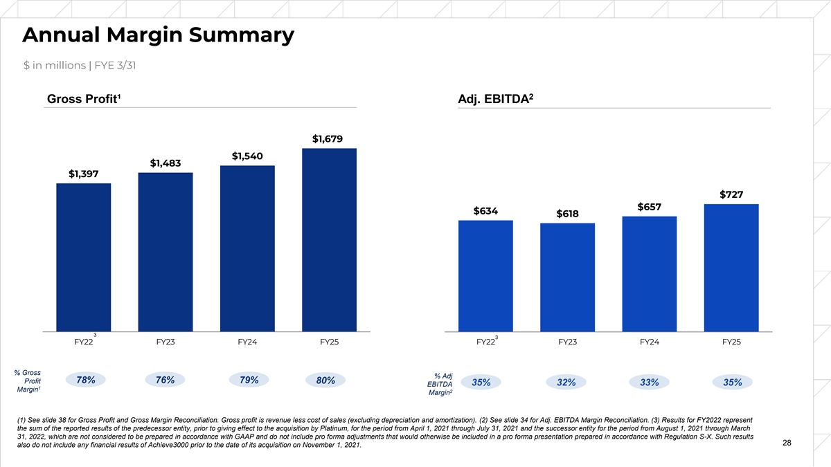Annual Margin Summary $ in millions | FYE 3/31 2 Gross Profit¹ Adj. EBITDA $1,679 $1,540 $1,483 $1,397 $727 $657 $634 $618 3 3 FY22 FY23 FY24 FY25 FY22 FY23 FY24 FY25 % Gross % Adj 78% 76% 79% Profit 80% 35% 32% 33% 35% EBITDA 1 Margin 2 Margin (1) See slide 38 for Gross Profit and Gross Margin Reconciliation. Gross profit is revenue less cost of sales (excluding depreciation and amortization). (2) See slide 34 for Adj. EBITDA Margin Reconciliation. (3) Results for FY2022 represent the sum of the reported results of the predecessor entity, prior to giving effect to the acquisition by Platinum, for the period from April 1, 2021 through July 31, 2021 and the successor entity for the period from August 1, 2021 through March 31, 2022, which are not considered to be prepared in accordance with GAAP and do not include pro forma adjustments that would otherwise be included in a pro forma presentation prepared in accordance with Regulation S-X. Such results 28 also do not include any financial results of Achieve3000 prior to the date of its acquisition on November 1, 2021.