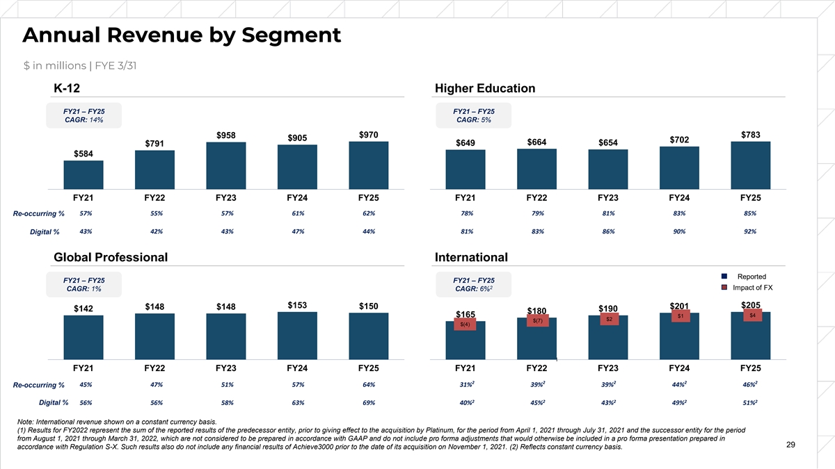 Annual Revenue by Segment $ in millions | FYE 3/31 K-12 Higher Education FY21 – FY25 FY21 – FY25 CAGR: 14% CAGR: 5% $958 $970 $783 $905 $702 $664 $649 $654 $791 $584 FY21 FY22 FY23 FY24 FY25 FY21 FY22 FY23 FY24 FY25 57% 55% 57% 61% 62% 78% 79% 81% 83% 85% Re-occurring % 43% 42% 43% 47% 44% 81% 83% 86% 90% 92% Digital % Global Professional International Reported FY21 – FY25 FY21 – FY25 2 Impact of FX CAGR: 1% CAGR: 6% $153 $205 $150 $201 $148 $148 $142 $190 $180 $4 $165 $1 $2 $(7) $(4) 1 FY21 FY22 FY23 FY24 FY25 FY21 FY22 FY23 FY24 FY25 2 2 2 2 2 Re-occurring % 45% 47% 51% 57% 64% 31% 39% 39% 44% 46% 2 2 2 2 2 Digital % 56% 56% 58% 63% 69% 40% 45% 43% 49% 51% Note: International revenue shown on a constant currency basis. (1) Results for FY2022 represent the sum of the reported results of the predecessor entity, prior to giving effect to the acquisition by Platinum, for the period from April 1, 2021 through July 31, 2021 and the successor entity for the period from August 1, 2021 through March 31, 2022, which are not considered to be prepared in accordance with GAAP and do not include pro forma adjustments that would otherwise be included in a pro forma presentation prepared in 29 accordance with Regulation S-X. Such results also do not include any financial results of Achieve3000 prior to the date of its acquisition on November 1, 2021. (2) Reflects constant currency basis.