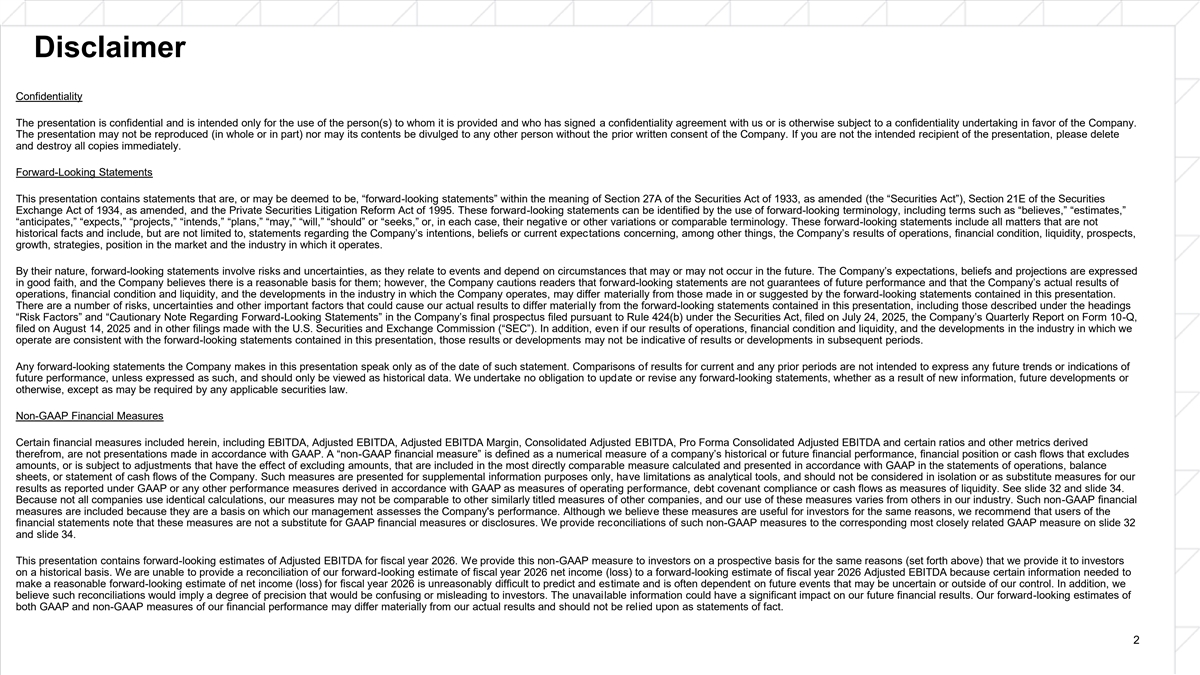 Disclaimer Confidentiality The presentation is confidential and is intended only for the use of the person(s) to whom it is provided and who has signed a confidentiality agreement with us or is otherwise subject to a confidentiality undertaking in favor of the Company. The presentation may not be reproduced (in whole or in part) nor may its contents be divulged to any other person without the prior written consent of the Company. If you are not the intended recipient of the presentation, please delete and destroy all copies immediately. Forward-Looking Statements This presentation contains statements that are, or may be deemed to be, “forward-looking statements” within the meaning of Section 27A of the Securities Act of 1933, as amended (the “Securities Act”), Section 21E of the Securities Exchange Act of 1934, as amended, and the Private Securities Litigation Reform Act of 1995. These forward-looking statements can be identified by the use of forward-looking terminology, including terms such as “believes,” “estimates,” “anticipates,” “expects,” “projects,” “intends,” “plans,” “may,” “will,” “should” or “seeks,” or, in each case, their negative or other variations or comparable terminology. These forward-looking statements include all matters that are not historical facts and include, but are not limited to, statements regarding the Company’s intentions, beliefs or current expectations concerning, among other things, the Company’s results of operations, financial condition, liquidity, prospects, growth, strategies, position in the market and the industry in which it operates. By their nature, forward-looking statements involve risks and uncertainties, as they relate to events and depend on circumstances that may or may not occur in the future. The Company’s expectations, beliefs and projections are expressed in good faith, and the Company believes there is a reasonable basis for them; however, the Company cautions readers that forward-looking statements are not guarantees of future performance and that the Company’s actual results of operations, financial condition and liquidity, and the developments in the industry in which the Company operates, may differ materially from those made in or suggested by the forward-looking statements contained in this presentation. There are a number of risks, uncertainties and other important factors that could cause our actual results to differ materially from the forward-looking statements contained in this presentation, including those described under the headings “Risk Factors” and “Cautionary Note Regarding Forward-Looking Statements” in the Company’s final prospectus filed pursuant to Rule 424(b) under the Securities Act, filed on July 24, 2025, the Company’s Quarterly Report on Form 10-Q, filed on August 14, 2025 and in other filings made with the U.S. Securities and Exchange Commission (“SEC”). In addition, even if our results of operations, financial condition and liquidity, and the developments in the industry in which we operate are consistent with the forward-looking statements contained in this presentation, those results or developments may not be indicative of results or developments in subsequent periods. Any forward-looking statements the Company makes in this presentation speak only as of the date of such statement. Comparisons of results for current and any prior periods are not intended to express any future trends or indications of future performance, unless expressed as such, and should only be viewed as historical data. We undertake no obligation to update or revise any forward-looking statements, whether as a result of new information, future developments or otherwise, except as may be required by any applicable securities law. Non-GAAP Financial Measures Certain financial measures included herein, including EBITDA, Adjusted EBITDA, Adjusted EBITDA Margin, Consolidated Adjusted EBITDA, Pro Forma Consolidated Adjusted EBITDA and certain ratios and other metrics derived therefrom, are not presentations made in accordance with GAAP. A “non-GAAP financial measure” is defined as a numerical measure of a company’s historical or future financial performance, financial position or cash flows that excludes amounts, or is subject to adjustments that have the effect of excluding amounts, that are included in the most directly comparable measure calculated and presented in accordance with GAAP in the statements of operations, balance sheets, or statement of cash flows of the Company. Such measures are presented for supplemental information purposes only, have limitations as analytical tools, and should not be considered in isolation or as substitute measures for our results as reported under GAAP or any other performance measures derived in accordance with GAAP as measures of operating performance, debt covenant compliance or cash flows as measures of liquidity. See slide 32 and slide 34. Because not all companies use identical calculations, our measures may not be comparable to other similarly titled measures of other companies, and our use of these measures varies from others in our industry. Such non-GAAP financial measures are included because they are a basis on which our management assesses the Company's performance. Although we believe these measures are useful for investors for the same reasons, we recommend that users of the financial statements note that these measures are not a substitute for GAAP financial measures or disclosures. We provide reconciliations of such non-GAAP measures to the corresponding most closely related GAAP measure on slide 32 and slide 34. This presentation contains forward-looking estimates of Adjusted EBITDA for fiscal year 2026. We provide this non-GAAP measure to investors on a prospective basis for the same reasons (set forth above) that we provide it to investors on a historical basis. We are unable to provide a reconcili