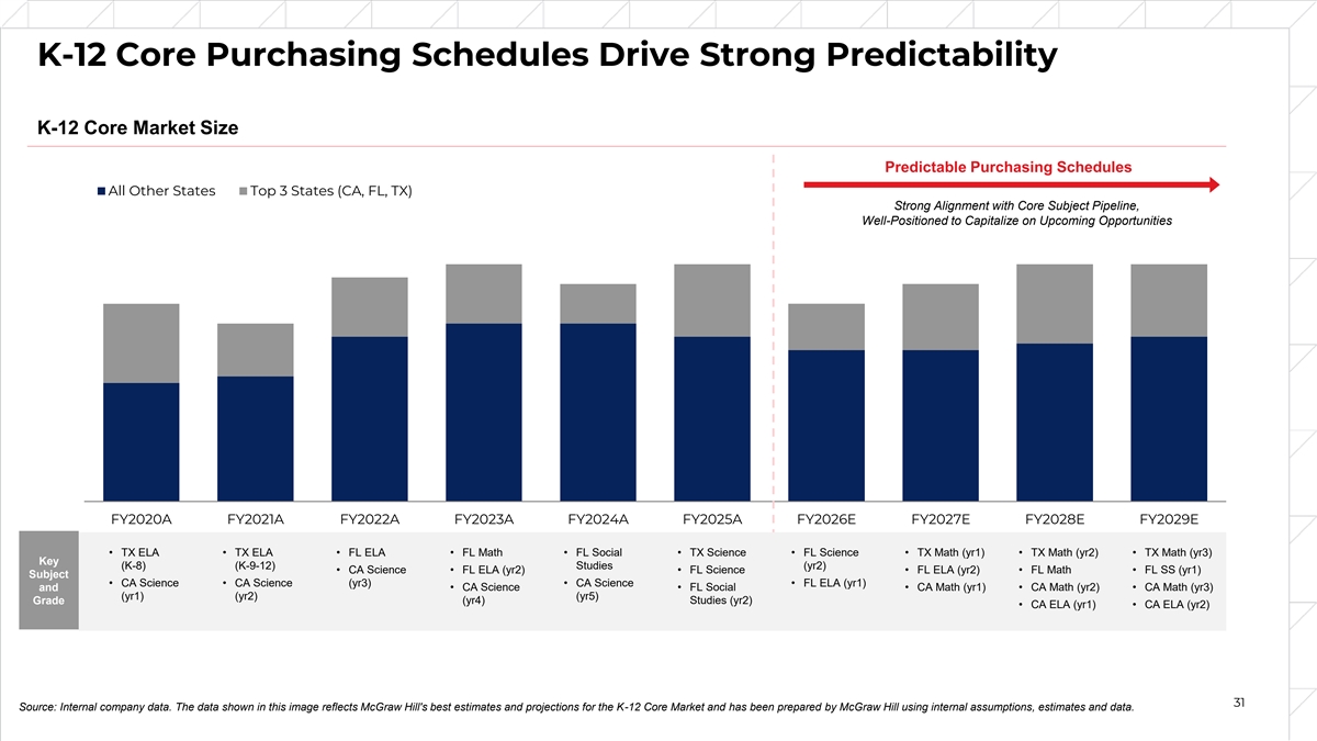 K-12 Core Purchasing Schedules Drive Strong Predictability K-12 Core Market Size Predictable Purchasing Schedules All Other States Top 3 States (CA, FL, TX) Strong Alignment with Core Subject Pipeline, Well-Positioned to Capitalize on Upcoming Opportunities FY2020A FY2021A FY2022A FY2023A FY2024A FY2025A FY2026E FY2027E FY2028E FY2029E • TX ELA • TX ELA • FL ELA • FL Math • FL Social • TX Science • FL Science • TX Math (yr1)​ • TX Math (yr2)​ • TX Math (yr3)​ Key (K-8) (K-9-12) Studies (yr2) • CA Science • FL ELA (yr2) • FL Science • FL ELA (yr2)​ • FL Math ​ • FL SS (yr1) ​ Subject • CA Science • CA Science (yr3) • CA Science • FL ELA (yr1) and • CA Science • FL Social • CA Math (yr1)​ • CA Math (yr2) • CA Math (yr3)​ (yr1) (yr2) (yr5) (yr4) Studies (yr2) Grade • CA ELA (yr1)​ • CA ELA (yr2)​ 31 Source: Internal company data. The data shown in this image reflects McGraw Hill's best estimates and projections for the K-12 Core Market and has been prepared by McGraw Hill using internal assumptions, estimates and data.
