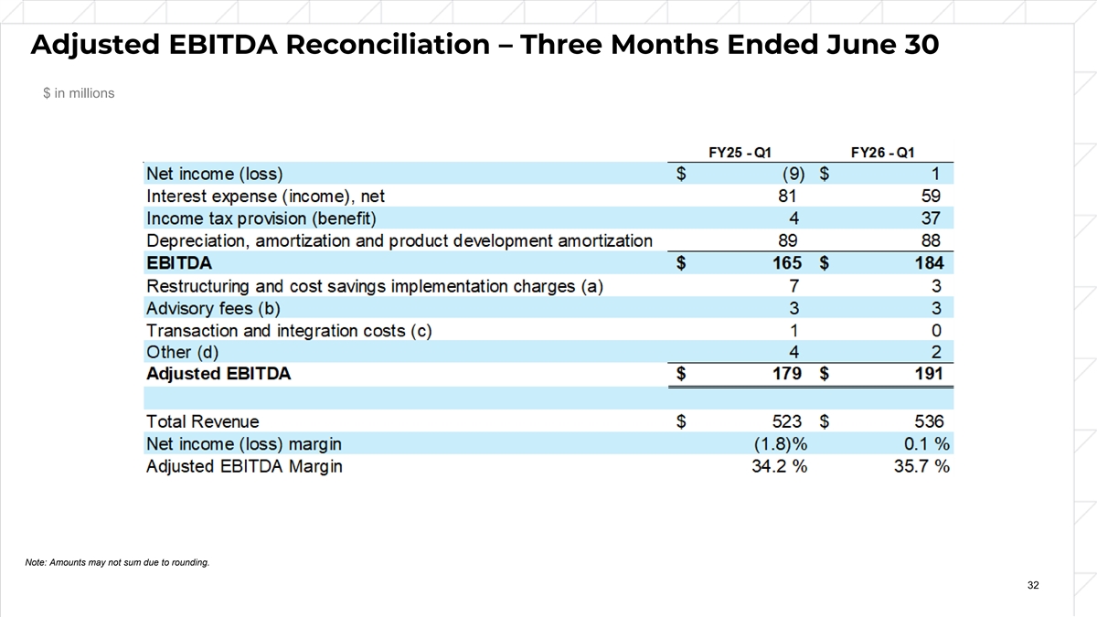 Adjusted EBITDA Reconciliation – Three Months Ended June 30 $ in millions Note: Amounts may not sum due to rounding. 32
