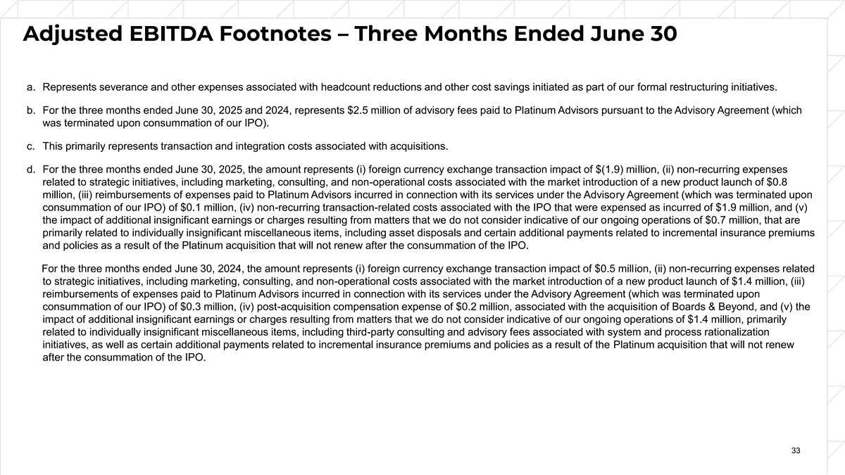 Adjusted EBITDA Footnotes – Three Months Ended June 30 a. Represents severance and other expenses associated with headcount reductions and other cost savings initiated as part of our formal restructuring initiatives. b. For the three months ended June 30, 2025 and 2024, represents $2.5 million of advisory fees paid to Platinum Advisors pursuant to the Advisory Agreement (which was terminated upon consummation of our IPO). c. This primarily represents transaction and integration costs associated with acquisitions. d. For the three months ended June 30, 2025, the amount represents (i) foreign currency exchange transaction impact of $(1.9) million, (ii) non-recurring expenses related to strategic initiatives, including marketing, consulting, and non-operational costs associated with the market introduction of a new product launch of $0.8 million, (iii) reimbursements of expenses paid to Platinum Advisors incurred in connection with its services under the Advisory Agreement (which was terminated upon consummation of our IPO) of $0.1 million, (iv) non-recurring transaction-related costs associated with the IPO that were expensed as incurred of $1.9 million, and (v) the impact of additional insignificant earnings or charges resulting from matters that we do not consider indicative of our ongoing operations of $0.7 million, that are primarily related to individually insignificant miscellaneous items, including asset disposals and certain additional payments related to incremental insurance premiums and policies as a result of the Platinum acquisition that will not renew after the consummation of the IPO. For the three months ended June 30, 2024, the amount represents (i) foreign currency exchange transaction impact of $0.5 million, (ii) non-recurring expenses related to strategic initiatives, including marketing, consulting, and non-operational costs associated with the market introduction of a new product launch of $1.4 million, (iii) reimbursements of expenses paid to Platinum Advisors incurred in connection with its services under the Advisory Agreement (which was terminated upon consummation of our IPO) of $0.3 million, (iv) post-acquisition compensation expense of $0.2 million, associated with the acquisition of Boards & Beyond, and (v) the impact of additional insignificant earnings or charges resulting from matters that we do not consider indicative of our ongoing operations of $1.4 million, primarily related to individually insignificant miscellaneous items, including third-party consulting and advisory fees associated with system and process rationalization initiatives, as well as certain additional payments related to incremental insurance premiums and policies as a result of the Platinum acquisition that will not renew after the consummation of the IPO. 33
