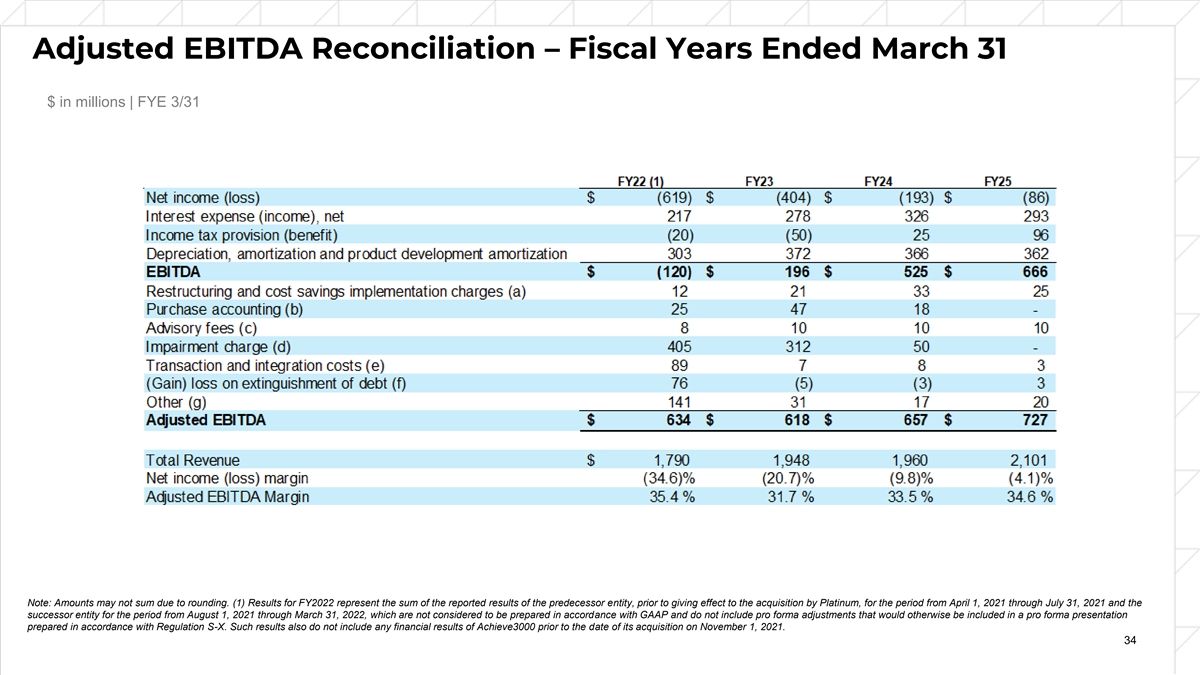 Adjusted EBITDA Reconciliation – Fiscal Years Ended March 31 $ in millions | FYE 3/31 Note: Amounts may not sum due to rounding. (1) Results for FY2022 represent the sum of the reported results of the predecessor entity, prior to giving effect to the acquisition by Platinum, for the period from April 1, 2021 through July 31, 2021 and the successor entity for the period from August 1, 2021 through March 31, 2022, which are not considered to be prepared in accordance with GAAP and do not include pro forma adjustments that would otherwise be included in a pro forma presentation prepared in accordance with Regulation S-X. Such results also do not include any financial results of Achieve3000 prior to the date of its acquisition on November 1, 2021. 34