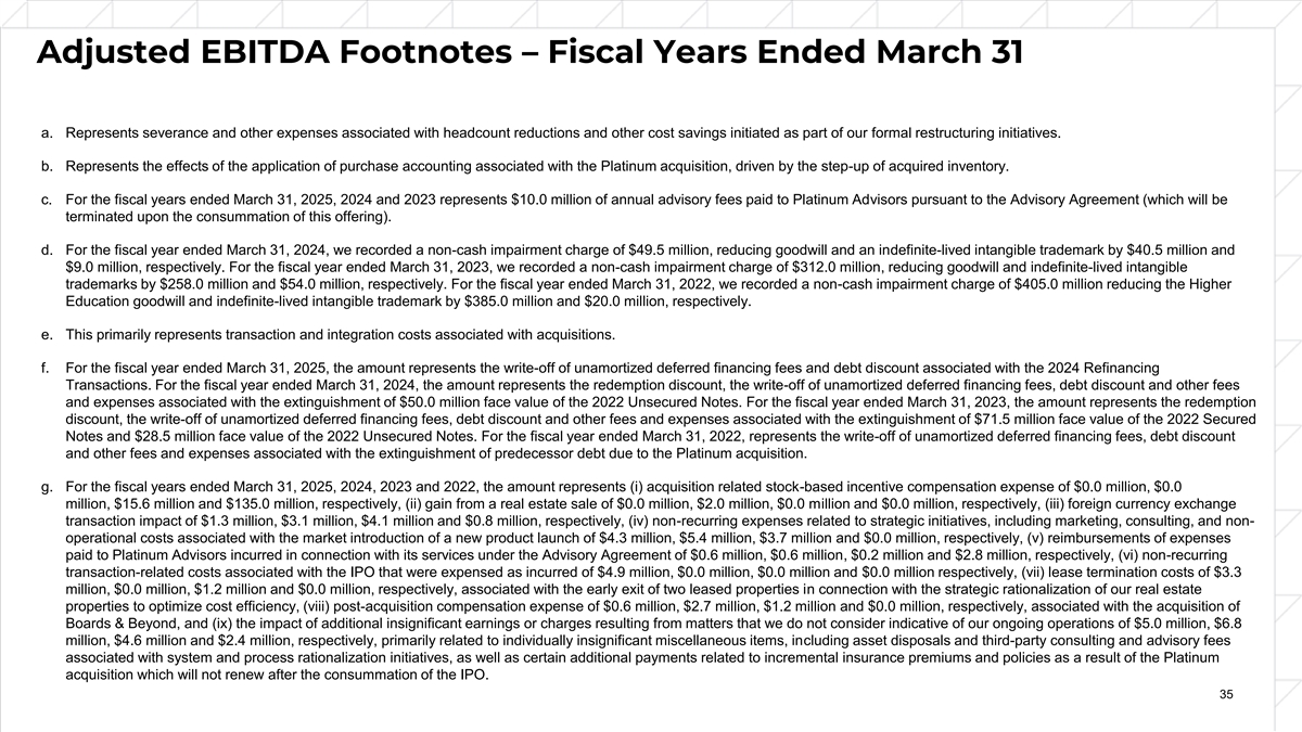 Adjusted EBITDA Footnotes – Fiscal Years Ended March 31 a. Represents severance and other expenses associated with headcount reductions and other cost savings initiated as part of our formal restructuring initiatives. b. Represents the effects of the application of purchase accounting associated with the Platinum acquisition, driven by the step-up of acquired inventory. c. For the fiscal years ended March 31, 2025, 2024 and 2023 represents $10.0 million of annual advisory fees paid to Platinum Advisors pursuant to the Advisory Agreement (which will be terminated upon the consummation of this offering). d. For the fiscal year ended March 31, 2024, we recorded a non-cash impairment charge of $49.5 million, reducing goodwill and an indefinite-lived intangible trademark by $40.5 million and $9.0 million, respectively. For the fiscal year ended March 31, 2023, we recorded a non-cash impairment charge of $312.0 million, reducing goodwill and indefinite-lived intangible trademarks by $258.0 million and $54.0 million, respectively. For the fiscal year ended March 31, 2022, we recorded a non-cash impairment charge of $405.0 million reducing the Higher Education goodwill and indefinite-lived intangible trademark by $385.0 million and $20.0 million, respectively. e. This primarily represents transaction and integration costs associated with acquisitions. f. For the fiscal year ended March 31, 2025, the amount represents the write-off of unamortized deferred financing fees and debt discount associated with the 2024 Refinancing Transactions. For the fiscal year ended March 31, 2024, the amount represents the redemption discount, the write-off of unamortized deferred financing fees, debt discount and other fees and expenses associated with the extinguishment of $50.0 million face value of the 2022 Unsecured Notes. For the fiscal year ended March 31, 2023, the amount represents the redemption discount, the write-off of unamortized deferred financing fees, debt discount and other fees and expenses associated with the extinguishment of $71.5 million face value of the 2022 Secured Notes and $28.5 million face value of the 2022 Unsecured Notes. For the fiscal year ended March 31, 2022, represents the write-off of unamortized deferred financing fees, debt discount and other fees and expenses associated with the extinguishment of predecessor debt due to the Platinum acquisition. g. For the fiscal years ended March 31, 2025, 2024, 2023 and 2022, the amount represents (i) acquisition related stock-based incentive compensation expense of $0.0 million, $0.0 million, $15.6 million and $135.0 million, respectively, (ii) gain from a real estate sale of $0.0 million, $2.0 million, $0.0 million and $0.0 million, respectively, (iii) foreign currency exchange transaction impact of $1.3 million, $3.1 million, $4.1 million and $0.8 million, respectively, (iv) non-recurring expenses related to strategic initiatives, including marketing, consulting, and non- operational costs associated with the market introduction of a new product launch of $4.3 million, $5.4 million, $3.7 million and $0.0 million, respectively, (v) reimbursements of expenses paid to Platinum Advisors incurred in connection with its services under the Advisory Agreement of $0.6 million, $0.6 million, $0.2 million and $2.8 million, respectively, (vi) non-recurring transaction-related costs associated with the IPO that were expensed as incurred of $4.9 million, $0.0 million, $0.0 million and $0.0 million respectively, (vii) lease termination costs of $3.3 million, $0.0 million, $1.2 million and $0.0 million, respectively, associated with the early exit of two leased properties in connection with the strategic rationalization of our real estate properties to optimize cost efficiency, (viii) post-acquisition compensation expense of $0.6 million, $2.7 million, $1.2 million and $0.0 million, respectively, associated with the acquisition of Boards & Beyond, and (ix) the impact of additional insignificant earnings or charges resulting from matters that we do not consider indicative of our ongoing operations of $5.0 million, $6.8 million, $4.6 million and $2.4 million, respectively, primarily related to individually insignificant miscellaneous items, including asset disposals and third-party consulting and advisory fees associated with system and process rationalization initiatives, as well as certain additional payments related to incremental insurance premiums and policies as a result of the Platinum acquisition which will not renew after the consummation of the IPO. 35