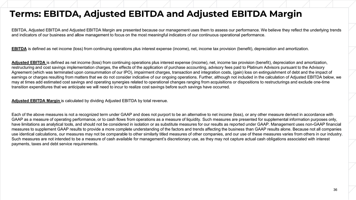 Terms: EBITDA, Adjusted EBITDA and Adjusted EBITDA Margin EBITDA, Adjusted EBITDA and Adjusted EBITDA Margin are presented because our management uses them to assess our performance. We believe they reflect the underlying trends and indicators of our business and allow management to focus on the most meaningful indicators of our continuous operational performance. EBITDA is defined as net income (loss) from continuing operations plus interest expense (income), net, income tax provision (benefit), depreciation and amortization. Adjusted EBITDA is defined as net income (loss) from continuing operations plus interest expense (income), net, income tax provision (benefit), depreciation and amortization, restructuring and cost savings implementation charges, the effects of the application of purchase accounting, advisory fees paid to Platinum Advisors pursuant to the Advisory Agreement (which was terminated upon consummation of our IPO), impairment charges, transaction and integration costs, (gain) loss on extinguishment of debt and the impact of earnings or charges resulting from matters that we do not consider indicative of our ongoing operations. Further, although not included in the calculation of Adjusted EBITDA below, we may at times add estimated cost savings and operating synergies related to operational changes ranging from acquisitions or dispositions to restructurings and exclude one-time transition expenditures that we anticipate we will need to incur to realize cost savings before such savings have occurred. Adjusted EBITDA Margin is calculated by dividing Adjusted EBITDA by total revenue. Each of the above measures is not a recognized term under GAAP and does not purport to be an alternative to net income (loss), or any other measure derived in accordance with GAAP as a measure of operating performance, or to cash flows from operations as a measure of liquidity. Such measures are presented for supplemental information purposes only, have limitations as analytical tools, and should not be considered in isolation or as substitute measures for our results as reported under GAAP. Management uses non-GAAP financial measures to supplement GAAP results to provide a more complete understanding of the factors and trends affecting the business than GAAP results alone. Because not all companies use identical calculations, our measures may not be comparable to other similarly titled measures of other companies, and our use of these measures varies from others in our industry. Such measures are not intended to be a measure of cash available for management’s discretionary use, as they may not capture actual cash obligations associated with interest payments, taxes and debt service requirements. 36