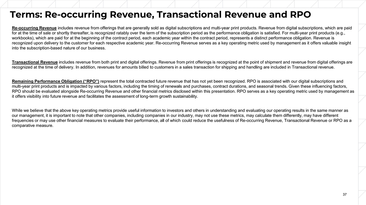 Terms: Re-occurring Revenue, Transactional Revenue and RPO Re-occurring Revenue includes revenue from offerings that are generally sold as digital subscriptions and multi-year print products. Revenue from digital subscriptions, which are paid for at the time of sale or shortly thereafter, is recognized ratably over the term of the subscription period as the performance obligation is satisfied. For multi-year print products (e.g., workbooks), which are paid for at the beginning of the contract period, each academic year within the contract period, represents a distinct performance obligation. Revenue is recognized upon delivery to the customer for each respective academic year. Re-occurring Revenue serves as a key operating metric used by management as it offers valuable insight into the subscription-based nature of our business. Transactional Revenue includes revenue from both print and digital offerings. Revenue from print offerings is recognized at the point of shipment and revenue from digital offerings are recognized at the time of delivery. In addition, revenues for amounts billed to customers in a sales transaction for shipping and handling are included in Transactional revenue. Remaining Performance Obligation (“RPO”) represent the total contracted future revenue that has not yet been recognized. RPO is associated with our digital subscriptions and multi-year print products and is impacted by various factors, including the timing of renewals and purchases, contract durations, and seasonal trends. Given these influencing factors, RPO should be evaluated alongside Re-occurring Revenue and other financial metrics disclosed within this presentation. RPO serves as a key operating metric used by management as it offers visibility into future revenue and facilitates the assessment of long-term growth sustainability. While we believe that the above key operating metrics provide useful information to investors and others in understanding and evaluating our operating results in the same manner as our management, it is important to note that other companies, including companies in our industry, may not use these metrics, may calculate them differently, may have different frequencies or may use other financial measures to evaluate their performance, all of which could reduce the usefulness of Re-occurring Revenue, Transactional Revenue or RPO as a comparative measure. 37