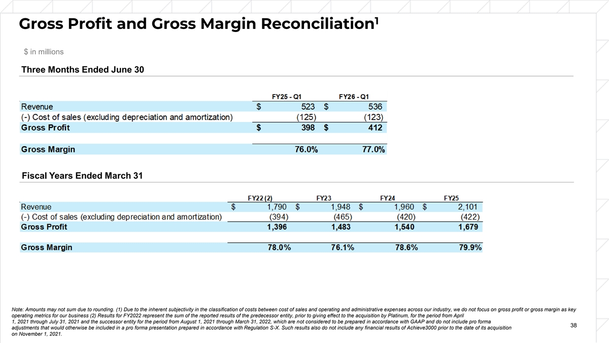 1 Gross Profit and Gross Margin Reconciliation $ in millions Three Months Ended June 30 Fiscal Years Ended March 31 Note: Amounts may not sum due to rounding. (1) Due to the inherent subjectivity in the classification of costs between cost of sales and operating and administrative expenses across our industry, we do not focus on gross profit or gross margin as key operating metrics for our business (2) Results for FY2022 represent the sum of the reported results of the predecessor entity, prior to giving effect to the acquisition by Platinum, for the period from April 1, 2021 through July 31, 2021 and the successor entity for the period from August 1, 2021 through March 31, 2022, which are not considered to be prepared in accordance with GAAP and do not include pro forma 38 adjustments that would otherwise be included in a pro forma presentation prepared in accordance with Regulation S-X. Such results also do not include any financial results of Achieve3000 prior to the date of its acquisition on November 1, 2021.