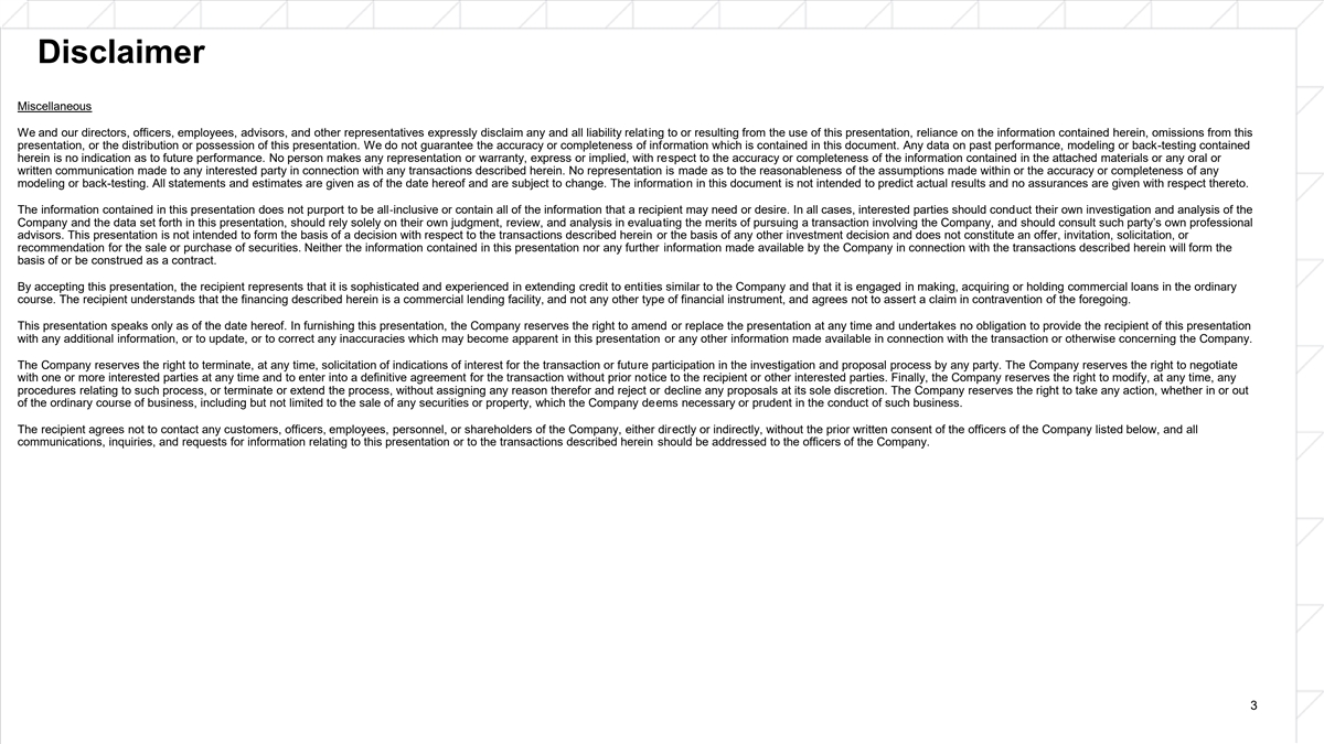 Disclaimer Miscellaneous We and our directors, officers, employees, advisors, and other representatives expressly disclaim any and all liability relating to or resulting from the use of this presentation, reliance on the information contained herein, omissions from this presentation, or the distribution or possession of this presentation. We do not guarantee the accuracy or completeness of information which is contained in this document. Any data on past performance, modeling or back-testing contained herein is no indication as to future performance. No person makes any representation or warranty, express or implied, with respect to the accuracy or completeness of the information contained in the attached materials or any oral or written communication made to any interested party in connection with any transactions described herein. No representation is made as to the reasonableness of the assumptions made within or the accuracy or completeness of any modeling or back-testing. All statements and estimates are given as of the date hereof and are subject to change. The information in this document is not intended to predict actual results and no assurances are given with respect thereto. The information contained in this presentation does not purport to be all‐inclusive or contain all of the information that a recipient may need or desire. In all cases, interested parties should conduct their own investigation and analysis of the Company and the data set forth in this presentation, should rely solely on their own judgment, review, and analysis in evaluating the merits of pursuing a transaction involving the Company, and should consult such party’s own professional advisors. This presentation is not intended to form the basis of a decision with respect to the transactions described herein or the basis of any other investment decision and does not constitute an offer, invitation, solicitation, or recommendation for the sale or purchase of securities. Neither the information contained in this presentation nor any further information made available by the Company in connection with the transactions described herein will form the basis of or be construed as a contract. By accepting this presentation, the recipient represents that it is sophisticated and experienced in extending credit to entities similar to the Company and that it is engaged in making, acquiring or holding commercial loans in the ordinary course. The recipient understands that the financing described herein is a commercial lending facility, and not any other type of financial instrument, and agrees not to assert a claim in contravention of the foregoing. This presentation speaks only as of the date hereof. In furnishing this presentation, the Company reserves the right to amend or replace the presentation at any time and undertakes no obligation to provide the recipient of this presentation with any additional information, or to update, or to correct any inaccuracies which may become apparent in this presentation or any other information made available in connection with the transaction or otherwise concerning the Company. The Company reserves the right to terminate, at any time, solicitation of indications of interest for the transaction or future participation in the investigation and proposal process by any party. The Company reserves the right to negotiate with one or more interested parties at any time and to enter into a definitive agreement for the transaction without prior notice to the recipient or other interested parties. Finally, the Company reserves the right to modify, at any time, any procedures relating to such process, or terminate or extend the process, without assigning any reason therefor and reject or decline any proposals at its sole discretion. The Company reserves the right to take any action, whether in or out of the ordinary course of business, including but not limited to the sale of any securities or property, which the Company deems necessary or prudent in the conduct of such business. The recipient agrees not to contact any customers, officers, employees, personnel, or shareholders of the Company, either directly or indirectly, without the prior written consent of the officers of the Company listed below, and all communications, inquiries, and requests for information relating to this presentation or to the transactions described herein should be addressed to the officers of the Company. 3