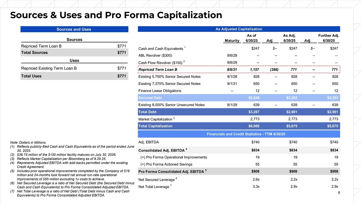 Sources & Uses and Pro Forma Capitalization ($ in millions) ($ in millions) As Adjusted Capitalization Sources and Uses As of As Adj. Further Adj. Sources Maturity 6/30/25 Adj. 6/30/25 Adj. 6/30/25 Repriced Term Loan B $771 1 $247 $-- $247 $-- $247 Cash and Cash Equivalents Total Sources $771 ABL Revolver ($300) 8/6/29 -- -- -- -- -- Uses 2 Cash Flow Revolver ($150) 8/6/29 -- -- -- -- -- Repriced Existing Term Loan B $771 Repriced Term Loan B 8/6/31 1,157 (386) 771 -- 771 Total Uses $771 Existing 5.750% Senior Secured Notes 8/1/28 828 -- 828 -- 828 Existing 7.375% Senior Secured Notes 9/1/31 650 -- 650 -- 650 Finance Lease Obligations -- 12 -- 12 -- 12 Secured Debt $2,648 $2,262 $2,262 Existing 8.000% Senior Unsecured Notes 8/1/29 639 -- 639 -- 639 Total Debt $3,287 $2,901 $2,901 3 2,773 2,773 2,773 Market Capitalization Total Capitalization $6,060 $5,675 $5,675 Financials and Credit Statistics - TTM 6/30/25 Note: Dollars in Millions. Adj. EBITDA $740 $740 $740 (1) Reflects publicly-filed Cash and Cash Equivalents as of the period ended June 4 $834 $834 $834 30, 2025. Consolidated Adj. EBITDA (2) $38.75 million of the $150 million facility matures on July 30, 2026. (+) Pro Forma Operational Improvements 19 19 19 (3) Reflects Market Capitalization per Bloomberg as of 8.29.25. (4) Represents Adjusted EBITDA with add-backs permitted under the existing (+) Pro Forma Actioned Savings 55 55 55 Credit Agreement. 5 (5) Includes prior operational improvements completed by the Company of $19 $908 $908 $908 Pro Forma Consolidated Adj. EBITDA million and 24-months look forward net annual run-rate operational 6 improvements of $55 million excluding 1x costs to achieve. Net Secured Leverage 2.6x 2.2x 2.2x (6) Net Secured Leverage is a ratio of Net Secured Debt (the Secured Debt minus 7 3.3x 2.9x 2.9x Net Total Leverage Cash and Cash Equivalents) to Pro Forma Consolidated Adjusted EBITDA. (7) Net Total Leverage is a ratio of Net Debt (Total Debt minus Cash and Cash 8 Equivalents) to Pro Forma Consolidated Adjusted EBITDA.