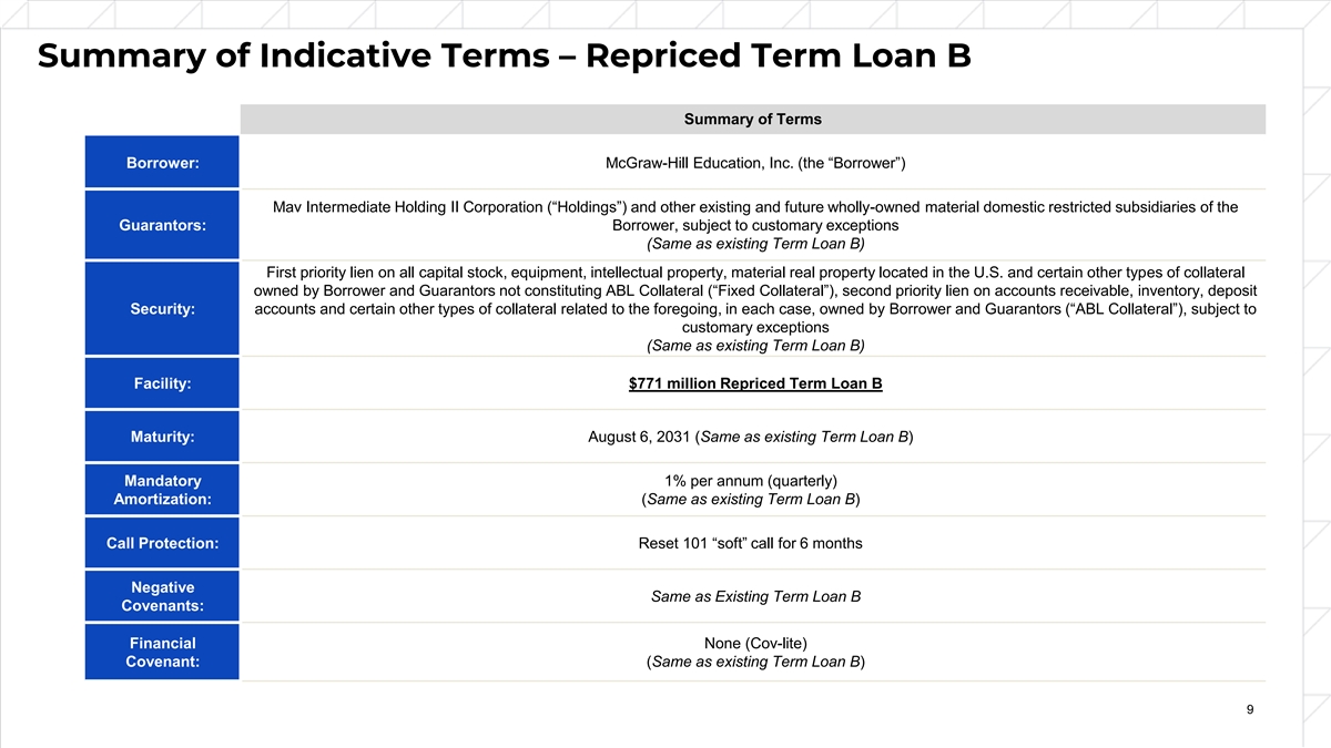 Summary of Indicative Terms – Repriced Term Loan B Summary of Terms Borrower: McGraw-Hill Education, Inc. (the “Borrower”) Mav Intermediate Holding II Corporation (“Holdings”) and other existing and future wholly-owned material domestic restricted subsidiaries of the Guarantors: Borrower, subject to customary exceptions (Same as existing Term Loan B) First priority lien on all capital stock, equipment, intellectual property, material real property located in the U.S. and certain other types of collateral owned by Borrower and Guarantors not constituting ABL Collateral (“Fixed Collateral”), second priority lien on accounts receivable, inventory, deposit Security: accounts and certain other types of collateral related to the foregoing, in each case, owned by Borrower and Guarantors (“ABL Collateral”), subject to customary exceptions (Same as existing Term Loan B) Facility: $771 million Repriced Term Loan B Maturity: August 6, 2031 (Same as existing Term Loan B) Mandatory 1% per annum (quarterly) Amortization: (Same as existing Term Loan B) Call Protection: Reset 101 “soft” call for 6 months Negative Same as Existing Term Loan B Covenants: Financial None (Cov-lite) Covenant: (Same as existing Term Loan B) 9 9