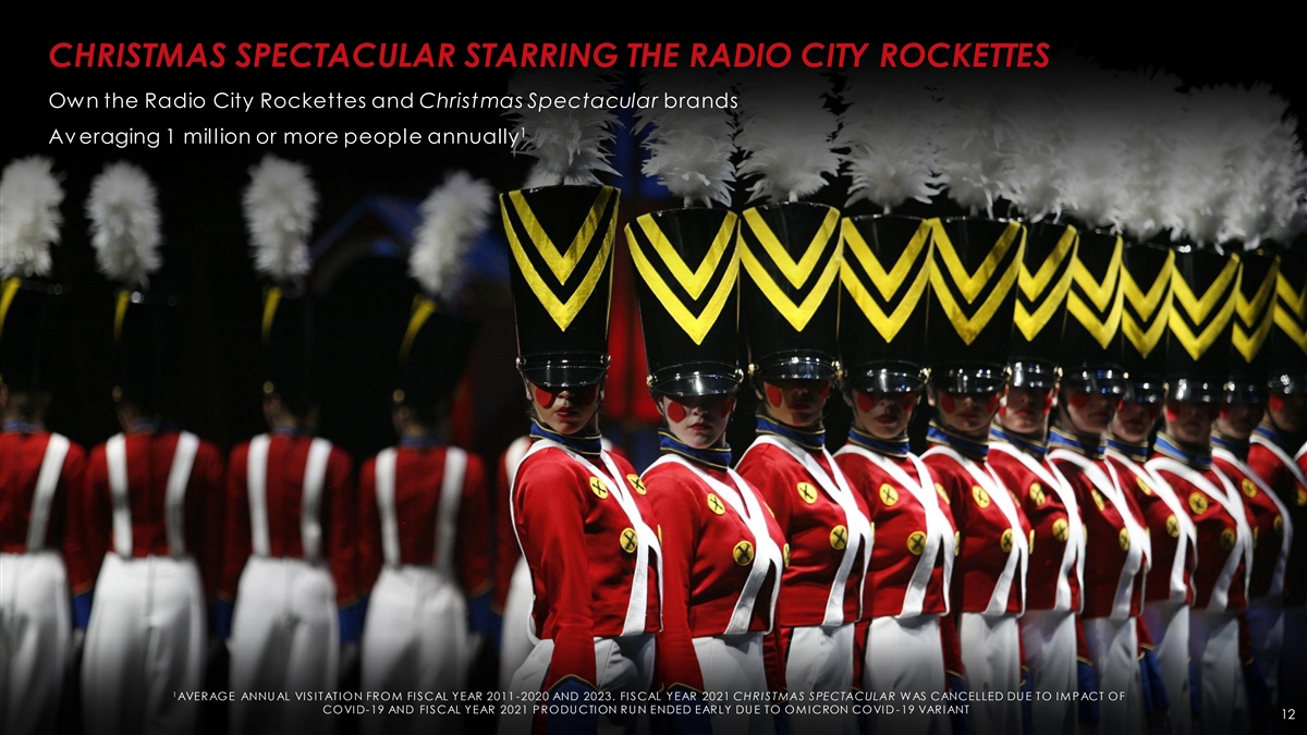 CHRISTMAS SPECTACULAR STARRING THE RADIO CITY ROCKETTES Own the Radio City Rockettes and Christmas Spectacular brands 1 Av eraging 1 million or more people annually 1 AVERAGE ANNU AL VISITATION FROM FISCAL YEAR 2011-2020 AND 2023. FISCAL YEAR 2021 CHRISTMAS SPECTACULAR WAS CANCELLED DU E TO IM PACT OF COVID-19 AND FISCAL YEAR 2021 PRODU CTION RU N ENDED EARLY DU E TO OM ICRON COVID -19 VARIANT 12