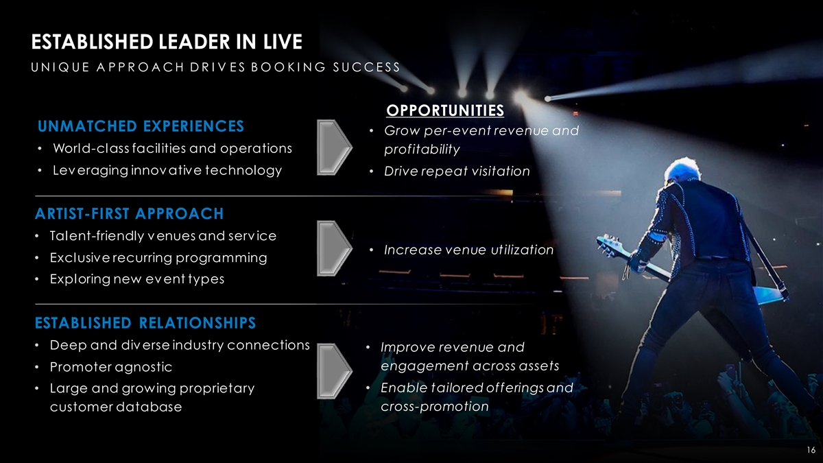 ESTABLISHED LEADER IN LIVE U N I Q U E A P P R O A C H D R I V E S B O O K I N G S U C C E S S OPPORTUNITIES UNMATCHED EXPERIENCES • Grow per-event revenue and • World-class facilities and operations profitability • Lev eraging innov ative technology • Drive repeat visitation ARTIST-FIRST APPROACH • Talent-friendly v enues and serv ice • Increase venue utilization • Exclusive recurring programming • Exploring new ev ent types ESTABLISHED RELATIONSHIPS • Deep and div erse industry connections • Improve revenue and engagement across assets • Promoter agnostic • Large and growing proprietary • Enable tailored offerings and cross-promotion customer database 16