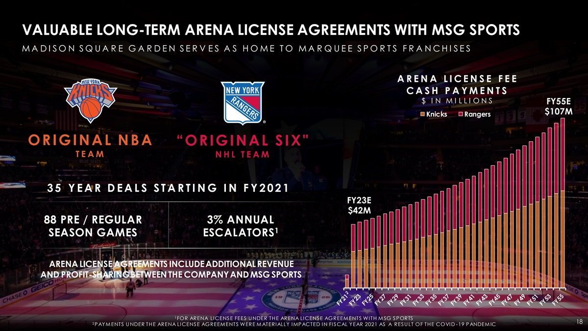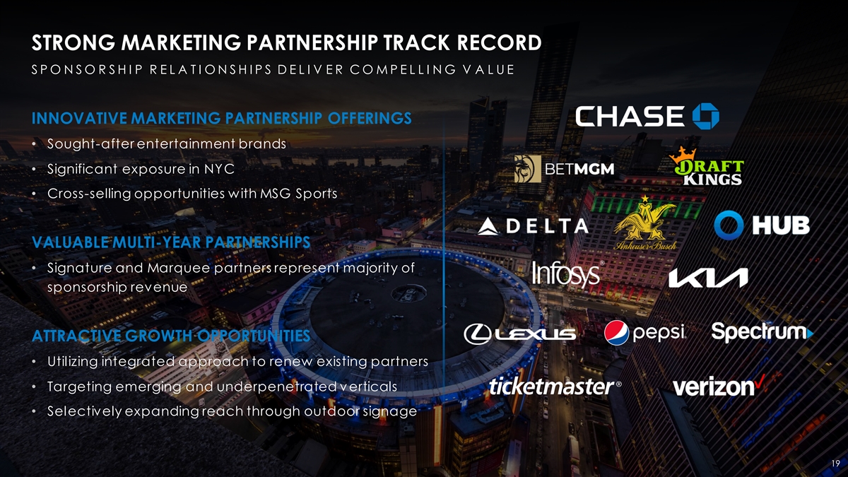 VALUABLE LONG-TERM ARENA LICENSE AGREEMENTS WITH MSG SPORTS M A D I S O N S Q U A R E G A R D E N S E R V E S A S H O M E T O M A R Q U E E S P O R T S F R A N C H I S E S A R E N A L I C E N S E F E E C A S H P A Y M E N T S $ I N M I L L I O N S FY55E $107M Knicks Rangers ORIGINAL NBA “ORIGINAL SIX T E A M N H L T E A M 3 5 Y E A R D E A L S S T A R T I N G I N F Y 2 0 2 1 FY23E $42M 88 PRE / REGULAR 3% ANNUAL 1 SEASON GAMES ESCALATORS ARENA LICENSE AGREEMENTS INCLUDE ADDITIONAL REVENUE AND PROFIT-SHARING BETWEEN THE COMPANY AND MSG SPORTS 1 FOR ARENA LICENSE FEES U NDER THE ARENA LICENSE AGREEM ENTS WITH M SG SPORTS 18 2 PAYM ENTS U NDER THE ARENA LICENSE AGREEM ENTS WERE M ATERIALLY IMPACTED IN FISCAL YEAR 2021 AS A RESU LT OF THE COVID -19 PANDEM IC