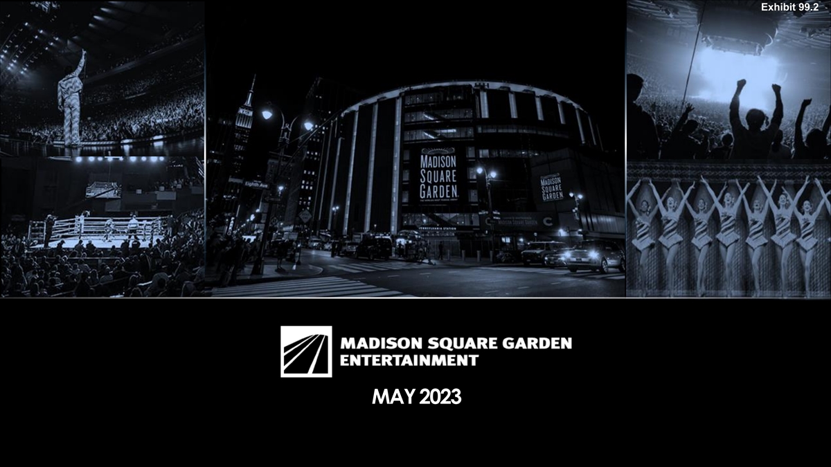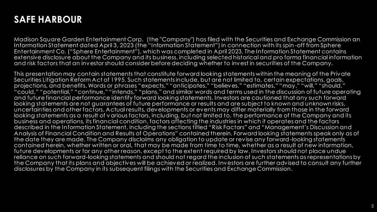 SAFE HARBOUR Madison Square Garden Entertainment Corp. (the Company ) has filed with the Securities and Exchange Commission an Information Statement dated April 3, 2023 (the “Information Statement”) in connection with its spin -off from Sphere Entertainment Co. (“Sphere Entertainment”), which was completed in April 2023. The Information Statement contains extensive disclosure about the Company and its business, including selected historical and pro forma financial information and risk factors that an investor should consider before deciding whether to invest in securities of the Company. This presentation may contain statements that constitute forward looking statements within the meaning of the Private Securities Litigation Reform Act of 1995. Such statements include, but are not limited to, certain expectations, goals, projections, and benefits. Words or phrases “expects,” “anticipates,” “believes,” “estimates,” “may,” “will,” “should,” “could,” “potential,” “continue,” “intends,” “plans,” and similar words and terms used in the discussion of future operating and future financial performance identify forward looking statements. Investors are cautioned that any such forward looking statements are not guarantees of future performance or results and are subject to known and unknown risks, uncertainties and other factors. Actual results, developments or events may differ materially from those in the forward looking statements as a result of v arious factors, including, but not limited to, the performance of the Company and its business and operations, its financial condition, factors affecting the industries in which it operates and the factors described in the Information Statement, including the sections titled “Risk Factors” and “Management’s Discussion and Analysis of Financial Condition and Results of Operations” contained therein. Forward looking statements speak only as of the date they are made. The Company disclaims any obligation to update or revise any forward -looking statements contained herein, whether written or oral, that may be made from time to time, whether as a result of new information, future developments or for any other reason, except to the extent required by law. Investors should not place undue reliance on such forward-looking statements and should not regard the inclusion of such statements as representations by the Company that its plans and objectives will be achieved or realized. Investors are further advised to consult any further disclosures by the Company in its subsequent filings with the Securities and Exchange Commission. 2