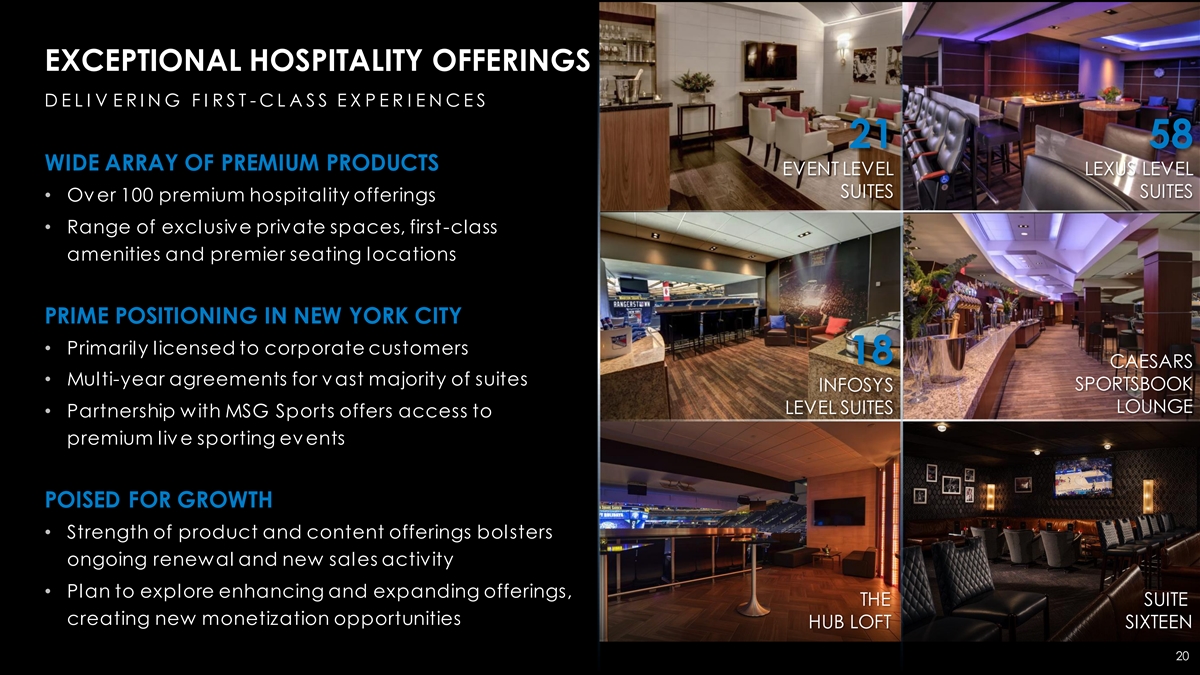 STRONG MARKETING PARTNERSHIP TRACK RECORD S P O N S O R S H I P R E L A T I O N S H I P S D E L I V E R C O M P E L L I N G V A L U E INNOVATIVE MARKETING PARTNERSHIP OFFERINGS • Sought-after entertainment brands • Significant exposure in NYC • Cross-selling opportunities with MSG Sports VALUABLE MULTI-YEAR PARTNERSHIPS • Signature and Marquee partners represent majority of sponsorship revenue ATTRACTIVE GROWTH OPPORTUNITIES • Utilizing integrated approach to renew existing partners • Targeting emerging and underpenetrated v erticals • Selectively expanding reach through outdoor signage 19