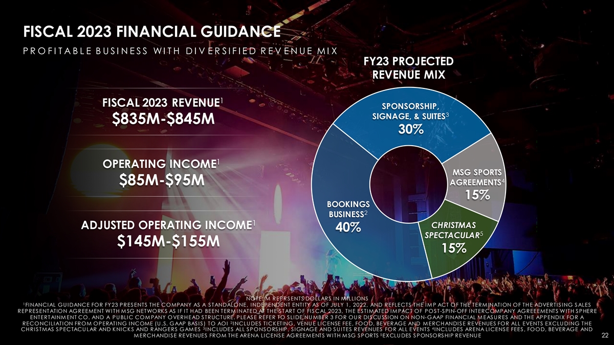 FISCAL 2023 FINANCIAL GUIDANCE P R O F I T A B L E B U S I N E S S W I T H D I V E R S I F I E D R E V E N U E M I X FY23 PROJECTED REVENUE MIX 1 FISCAL 2023 REVENUE SPONSORSHIP, 3 SIGNAGE, & SUITES $835M-$845M 30% 1 OPERATING INCOME MSG SPORTS 4 $85M-$95M AGREEMENTS 15% BOOKINGS 2 BUSINESS 1 CHRISTMAS ADJUSTED OPERATING INCOME 40% 5 SPECTACULAR $145M-$155M 15% NOTE: M REPRSENTS DOLLARS IN M ILLIONS 1 FINANCIAL GU IDANCE FOR FY23 PRESENTS THE COMPANY AS A STANDALONE, INDEPENDENT ENTITY AS OF JU LY 1, 2022, AND REFLECTS THE IM P ACT OF THE TERM INATION OF THE ADVERTISING SALES REPRESENTATION AGREEMENT WITH M SG NETWORKS AS IF IT HAD BEEN TERM INATED AT THE START OF FISCAL 2023, THE ESTIM ATED IM PACT OF POST-SPIN-OFF INTERCOMPANY AGREEEMENTS WITH SPHERE ENTERTAI NM ENT CO. AND A PU BLI C COM PANY OVERHEAD S TRUCTURE. PLEAS E REFER TO S LIDE NU MBER 3 FOR OU R DIS CU SSION ON NON-GAAP FINANCI AL M EASU RES AND THE APPENDIX FOR A 2 RECONCILIATION FROM OPERATING INCOME (U .S. GAAP BASIS) TO AOI INCLU DES TICKETING, VENU E LICENSE FEE, FOOD, BEVERAGE AND M ERCHANDISE REVENUES FOR ALL EVENTS EXCLU DING THE 3 4 CHRISTMAS SPECTACU LAR AND KNICKS AND RANGERS GAM ES INCLUDES ALL SPONSORSHIP, SIGNAGE AND SU ITES REVENUES FOR ALL EVENTS INCLU DES ARENA LICENSE FEES, FOOD, BEVERAGE AND 5 M ERCHANDI SE REVENUES FROM THE ARENA LI CENSE AGREEM ENTS WI TH M SG SPORTS EXCLU DES SPONSORSHIP REVENU E 22