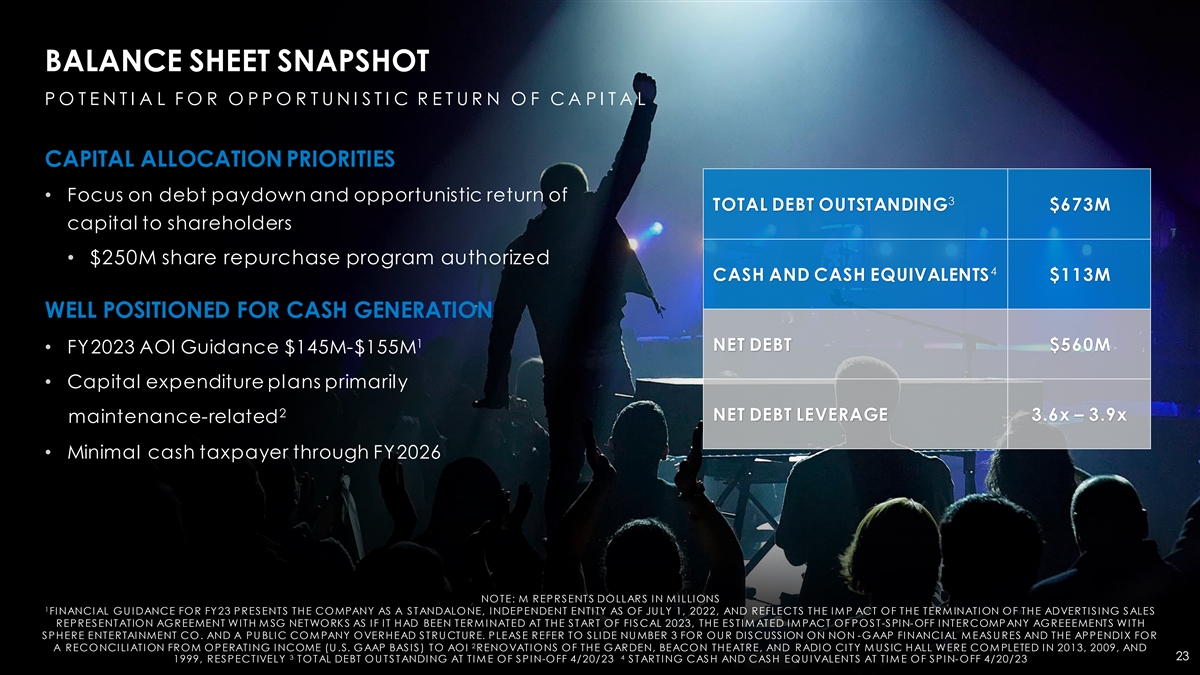 BALANCE SHEET SNAPSHOT P O T E N T I A L F O R O P P O R T U N I S T I C R E T U R N O F C A P I T A L CAPITAL ALLOCATION PRIORITIES • Focus on debt paydown and opportunistic return of 3 TOTAL DEBT OUTSTANDING $673M capital to shareholders • $250M share repurchase program authorized 4 CASH AND CASH EQUIVALENTS $113M WELL POSITIONED FOR CASH GENERATION 1 NET DEBT $560M • FY2023 AOI Guidance $145M-$155M • Capital expenditure plans primarily 2 NET DEBT LEVERAGE 3.6x – 3.9x maintenance-related • Minimal cash taxpayer through FY2026 NOTE: M REPRSENTS DOLLARS IN M ILLIONS 1 FINANCIAL GU IDANCE FOR FY23 PRESENTS THE COMPANY AS A STANDALONE, INDEPENDENT ENTITY AS OF JU LY 1, 2022, AND REFLECTS THE IM P ACT OF THE TERM INATION OF THE ADVERTISING SALES REPRESENTATION AGREEMENT WITH M SG NETWORKS AS IF IT HAD BEEN TERM INATED AT THE START OF FISCAL 2023, THE ESTIM ATED IM PACT OF POS T-SPIN-OFF INTERCOMPANY AGREEEMENTS WI TH SPHERE ENTERTAINMENT CO. AND A PU BLIC COM PANY OVERHEAD STRU CTURE. PLEASE REFER TO SLIDE NU MBER 3 FOR OU R DISCUSSION ON NON -GAAP FINANCIAL M EASU RES AND THE APPENDIX FOR 2 A RECONCILIATION FROM OPERATING INCOME (U .S. GAAP BASIS) TO AOI RENOVATIONS OF THE GARDEN, BEACON THEATRE, AND RADIO CITY M U SIC HALL WERE COM PLETED IN 2013, 2009, AND 3 4 23 1999, RESPECTIVELY TOTAL DEBT OU TS TANDING AT TIM E OF S PIN-OFF 4/20/23 S TARTI NG CAS H AND CAS H EQU I VALENTS AT TI M E OF S PI N-OFF 4/20/23