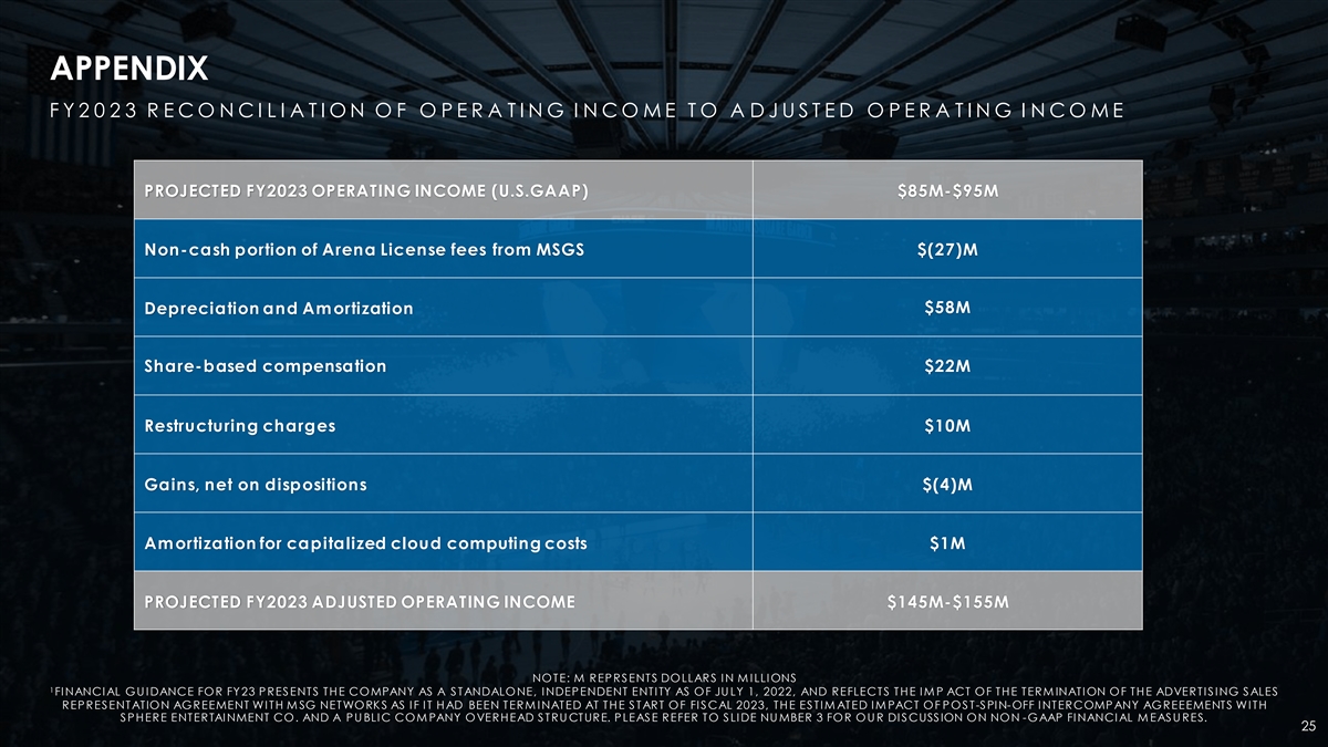 APPENDIX F Y 2 0 2 3 R E C O N C I L I A T I O N O F O P E R A T I N G I N C O M E T O A D J U S T E D O P E R A T I N G I N C O M E PROJECTED FY2023 OPERATING INCOME (U.S.GAAP) $85M-$95M Non-cash portion of Arena License fees from MSGS $(27)M Depreciation and Amortization $58M Share-based compensation $22M Restructuring charges $10M Gains, net on dispositions $(4)M Amortization for capitalized cloud computing costs $1M PROJECTED FY2023 ADJUSTED OPERATING INCOME $145M-$155M NOTE: M REPRSENTS DOLLARS IN M ILLIONS 1 FINANCIAL GU IDANCE FOR FY23 PRESENTS THE COMPANY AS A STANDALONE, INDEPENDENT ENTITY AS OF JU LY 1, 2022, AND REFLECTS THE IM P ACT OF THE TERM INATION OF THE ADVERTISING SALES REPRESENTATION AGREEMENT WITH M SG NETWORKS AS IF IT HAD BEEN TERM INATED AT THE START OF FISCAL 2023, THE ESTIM ATED IM PACT OF POS T-SPIN-OFF INTERCOMPANY AGREEEMENTS WI TH SPHERE ENTERTAINMENT CO. AND A PU BLIC COM PANY OVERHEAD STRU CTURE. PLEASE REFER TO SLIDE NU MBER 3 FOR OU R DISCUSSION ON NON -GAAP FINANCIAL M EASU RES. 25