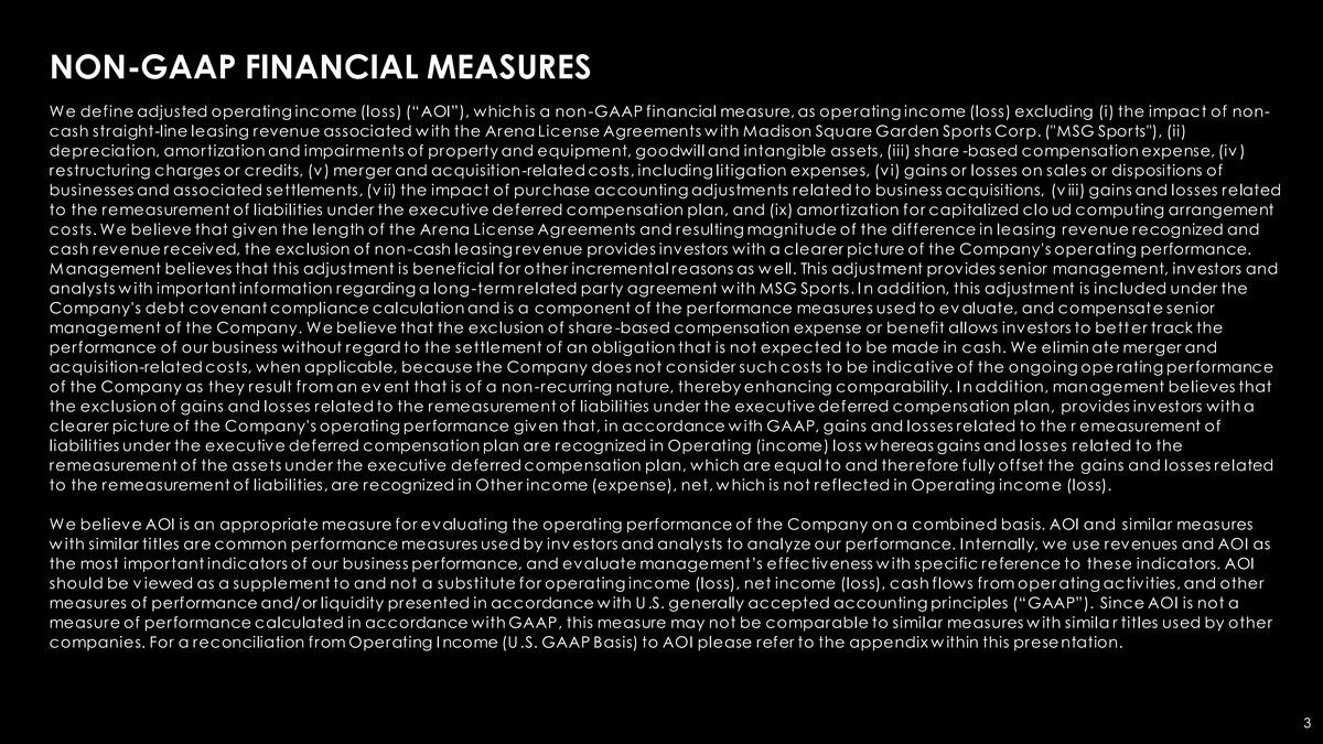 NON-GAAP FINANCIAL MEASURES We define adjusted operating income (loss) (“AOI”), which is a non-GAAP financial measure, as operating income (loss) excluding (i) the impact of non- cash straight-line leasing revenue associated w ith the Arena License Agreements w ith Madison Square Garden Sports Corp. ( MSG Sports ), (ii) depreciation, amortization and impairments of property and equipment, goodwill and intangible assets, (iii) share -based compensation expense, (iv ) restructuring charges or credits, (v) merger and acquisition-related costs, including litigation expenses, (vi) gains or losses on sales or dispositions of businesses and associated settlements, (v ii) the impact of purchase accounting adjustments related to business acquisitions, (v iii) gains and losses related to the remeasurement of liabilities under the executive deferred compensation plan, and (ix) amortization for capitalized clo ud computing arrangement costs. We believe that given the length of the Arena License Agreements and resulting magnitude of the difference in leasing revenue recognized and cash revenue received, the exclusion of non-cash leasing revenue provides investors with a clearer picture of the Company's operating performance. M anagement believes that this adjustment is beneficial for other incremental reasons as w ell. This adjustment provides senior management, investors and analysts w ith important information regarding a long-term related party agreement w ith MSG Sports. I n addition, this adjustment is included under the Company's debt covenant compliance calculation and is a component of the performance measures used to ev aluate, and compensate senior management of the Company. We believe that the exclusion of share -based compensation expense or benefit allows investors to better track the performance of our business without regard to the settlement of an obligation that is not expected to be made in cash. We elimin ate merger and acquisition-related costs, when applicable, because the Company does not consider such costs to be indicative of the ongoing ope rating performance of the Company as they result from an ev ent that is of a non-recurring nature, thereby enhancing comparability. I n addition, management believes that the exclusion of gains and losses related to the remeasurement of liabilities under the executive deferred compensation plan, provides investors with a clearer picture of the Company's operating performance given that, in accordance w ith GAAP, gains and losses related to the r emeasurement of liabilities under the executive deferred compensation plan are recognized in Operating (income) loss w hereas gains and losses related to the remeasurement of the assets under the executive deferred compensation plan, which are equal to and therefore fully offset the gains and losses related to the remeasurement of liabilities, are recognized in Other income (expense), net, w hich is not reflected in Operating income (loss). We believe AOI is an appropriate measure for evaluating the operating performance of the Company on a combined basis. AOI and similar measures w ith similar titles are common performance measures used by inv estors and analysts to analyze our performance. Internally, we use revenues and AOI as the most important indicators of our business performance, and evaluate management’s effectiveness w ith specific reference to these indicators. AOI should be v iewed as a supplement to and not a substitute for operating income (loss), net income (loss), cash flows from oper ating activities, and other measures of performance and/or liquidity presented in accordance w ith U .S. generally accepted accounting principles (“GAAP”). Since AOI is not a measure of performance calculated in accordance with GAAP, this measure may not be comparable to similar measures w ith simila r titles used by other companies. For a reconciliation from Operating I ncome (U .S. GAAP Basis) to AOI please refer to the appendix w ithin this prese ntation. 3