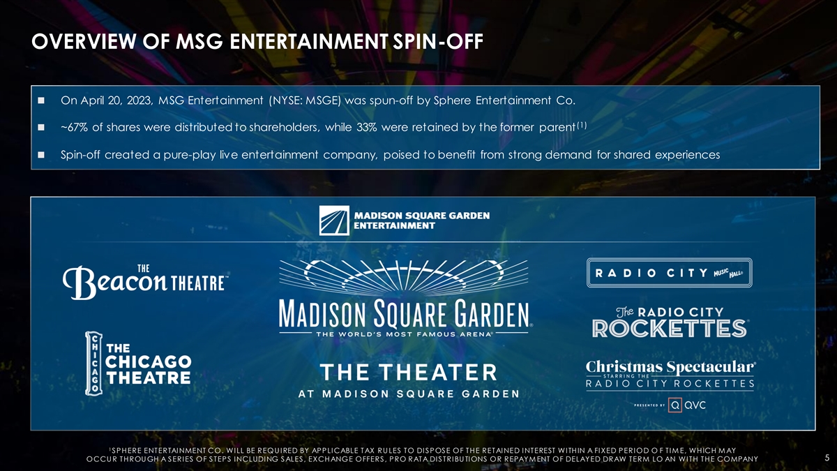 OVERVIEW OF MSG ENTERTAINMENT SPIN-OFF ◼ On April 20, 2023, MSG Entertainment (NYSE: MSGE) was spun-off by Sphere Entertainment Co. (1) ◼ ~67% of shares were distributed to shareholders, while 33% were retained by the former parent ◼ Spin-off created a pure-play live entertainment company, poised to benefit from strong demand for shared experiences 1 SPHERE ENTERTAINMENT CO. WILL BE REQU IRED BY APPLICABLE TAX RU LES TO DISPOSE OF THE RETAINED INTEREST WITHIN A FIXED PERIOD O F TIM E, WHICH M AY 5 OCCU R THROU GH A SERIES OF STEPS INCLUDING SALES, EXCHANGE OFFERS, PRO RATA DISTRIBU TIONS OR REPAYM ENT OF DELAYED DRAW TERM LO AN WITH THE COMPANY