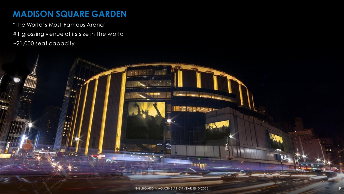 5 ICONIC VENUES ~900 LIVE EVENTS ACROSS NEW YORK AND CHICAGO PROJECTED IN FISCAL 2023 5+ MILLION GUESTS PROJECTED IN FISCAL 2023 35 YEAR DEALS 89 YEARS TO HOST HOME GAMES FOR OF THE CHRISTMAS SPECTACULAR NEW YORK KNICKS & RANGERS STARRING THE RADIO CITY ROCKETTES 8