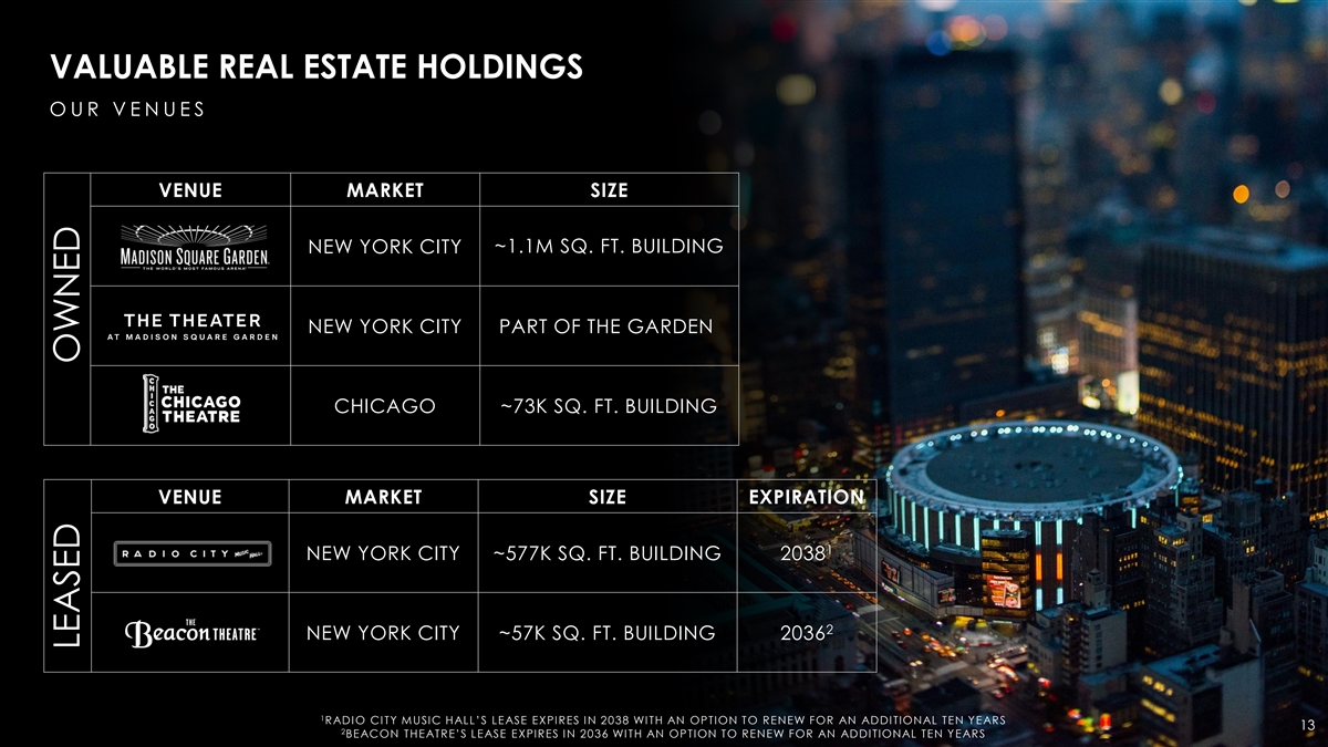 VALUABLE REAL ESTATE HOLDINGS O U R V E N U E S VENUE MARKET SIZE NEW YORK CITY ~1.1M SQ. FT. BUILDING NEW YORK CITY PART OF THE GARDEN CHICAGO ~73K SQ. FT. BUILDING VENUE MARKET SIZE EXPIRATION 1 NEW YORK CITY ~577K SQ. FT. BUILDING 2038 2 NEW YORK CITY ~57K SQ. FT. BUILDING 2036 1 RADIO CITY MUSIC HALL’S LEASE EXPIRES IN 2038 WITH AN OPTION TO RENEW FOR AN ADDITIONAL TEN YEARS 13 2 BEACON THEATRE’S LEASE EXPIRES IN 2036 WITH AN OPTION TO RENEW FOR AN ADDITIONAL TEN YEARS LEASED OWNED