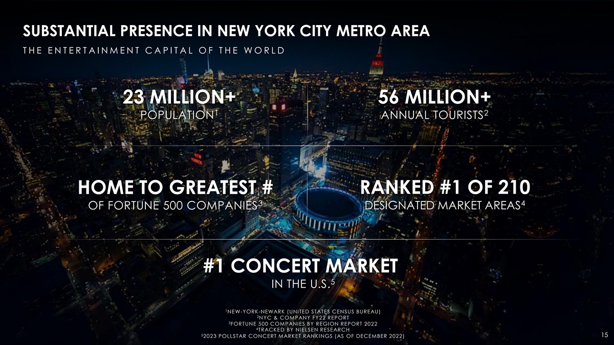 SUBSTANTIAL PRESENCE IN NEW YORK CITY METRO AREA T H E E N T E R T A I N M E N T C A P I T A L O F T H E W O R L D 23 MILLION+ 56 MILLION+ 1 2 POPULATION ANNUAL TOURISTS HOME TO GREATEST # RANKED #1 OF 210 4 3 OF FORTUNE 500 COMPANIES DESIGNATED MARKET AREAS #1 CONCERT MARKET 5 IN THE U.S. 1 NEW-YORK-NEWARK (UNITED STATES CENSUS BUREAU) 2 NYC & COMPANY FY22 REPORT 3 FORTUNE 500 COMPANIES BY REGION REPORT 2022 4 TRACKED BY NIELSEN RESEARCH 5 15 2023 POLLSTAR CONCERT MARKET RANKINGS (AS OF DECEMBER 2022)
