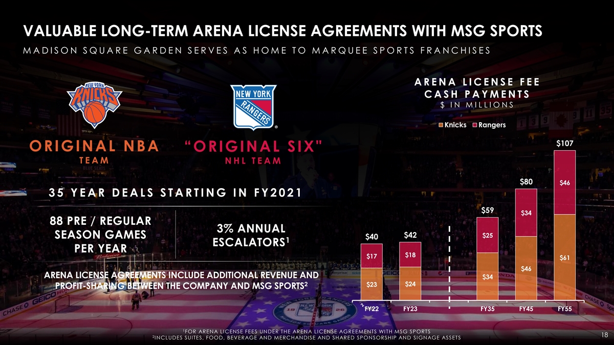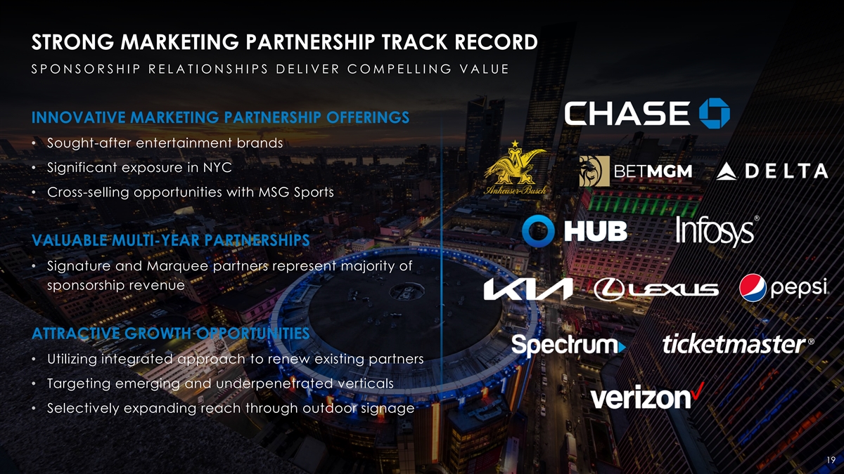 VALUABLE LONG-TERM ARENA LICENSE AGREEMENTS WITH MSG SPORTS M A D I S O N S Q U A R E G A R D E N S E R V E S A S H O M E T O M A R Q U E E S P O R T S F R A N C H I S E S A R E N A L I C E N S E F E E C A S H P A Y M E N T S $ I N M I L L I O N S Knicks Rangers $107 ORIGINAL NBA “ORIGINAL SIX T E A M N H L T E A M $80 $46 35 YEAR DEALS STARTING IN FY2021 $59 $34 88 PRE / REGULAR 3% ANNUAL $42 $25 SEASON GAMES $40 1 ESCALATORS PER YEAR $18 $17 $61 $46 ARENA LICENSE AGREEMENTS INCLUDE ADDITIONAL REVENUE AND $34 2 $24 $23 PROFIT-SHARING BETWEEN THE COMPANY AND MSG SPORTS FY22 FY23 FY35 FY45 FY55 1 FOR ARENA LICENSE FEES UNDER THE ARENA LICENSE AGREEMENTS WITH MSG SPORTS 18 2 INCLUDES SUITES, FOOD, BEVERAGE AND MERCHANDISE AND SHARED SPONSORSHIP AND SIGNAGE ASSETS