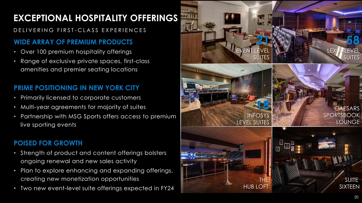 EXCEPTIONAL HOSPITALITY OFFERINGS D E L I V E R I N G F I R S T - C L A S S E X P E R I E N C E S WIDE ARRAY OF PREMIUM PRODUCTS 21 58 EVENT LEVEL LEXUS LEVEL • Over 100 premium hospitality offerings SUITES SUITES • Range of exclusive private spaces, first-class amenities and premier seating locations PRIME POSITIONING IN NEW YORK CITY • Primarily licensed to corporate customers • Multi-year agreements for majority of suites 18 CAESARS SPORTSBOOK INFOSYS • Partnership with MSG Sports offers access to premium LOUNGE LEVEL SUITES live sporting events POISED FOR GROWTH • Strength of product and content offerings bolsters ongoing renewal and new sales activity • Plan to explore enhancing and expanding offerings, creating new monetization opportunities THE SUITE HUB LOFT SIXTEEN • Two new event-level suite offerings expected in FY24 20