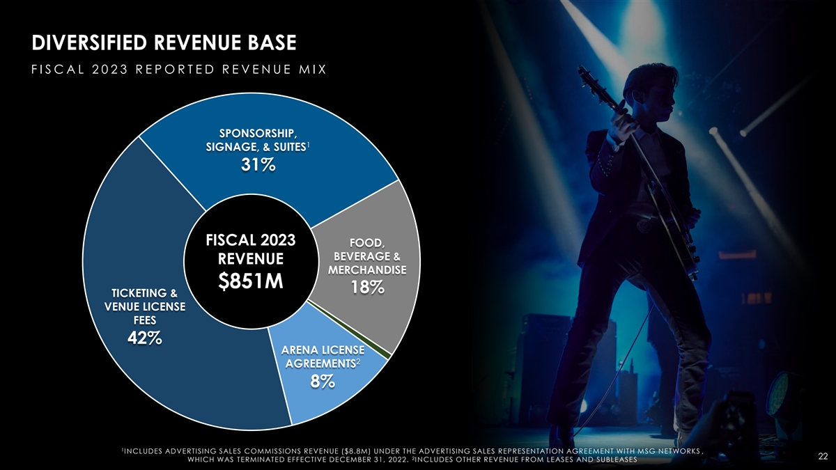 DIVERSIFIED REVENUE BASE F I S C A L 2 0 2 3 R E P O R T E D R E V E N U E M I X SPONSORSHIP, 1 SIGNAGE, & SUITES 31% FISCAL 2023 FOOD, BEVERAGE & REVENUE MERCHANDISE $851M 18% TICKETING & VENUE LICENSE FEES 42% ARENA LICENSE 2 AGREEMENTS 8% 1 INCLUDES ADVERTISING SALES COMMISSIONS REVENUE ($8.8M) UNDER THE ADVERTISING SALES REPRESENTATION AGREEMENT WITH MSG NETWORKS , 22 2 WHICH WAS TERMINATED EFFECTIVE DECEMBER 31, 2022. INCLUDES OTHER REVENUE FROM LEASES AND SUBLEASES