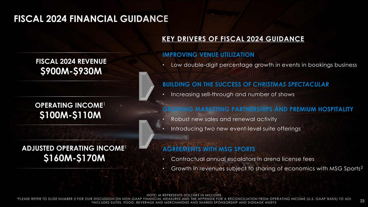FISCAL 2024 FINANCIAL GUIDANCE KEY DRIVERS OF FISCAL 2024 GUIDANCE IMPROVING VENUE UTILIZATION FISCAL 2024 REVENUE • Low double-digit percentage growth in events in bookings business $900M-$930M BUILDING ON THE SUCCESS OF CHRISTMAS SPECTACULAR • Increasing sell-through and number of shows 1 OPERATING INCOME GROWING MARKETING PARTNERSHIPS AND PREMIUM HOSPITALITY $100M-$110M • Robust new sales and renewal activity • Introducing two new event-level suite offerings 1 ADJUSTED OPERATING INCOME AGREEMENTS WITH MSG SPORTS • Contractual annual escalators in arena license fees $160M-$170M 2 • Growth in revenues subject to sharing of economics with MSG Sports NOTE: M REPRESENTS DOLLARS IN MILLIONS 1 PLEASE REFER TO SLIDE NUMBER 3 FOR OUR DISCUSSION ON NON -GAAP FINANCIAL MEASURES AND THE APPENDIX FOR A RECONCILIATION FROM OPER ATING INCOME (U.S. GAAP BASIS) TO AOI 23 2 INCLUDES SUITES, FOOD, BEVERAGE AND MERCHANDISE AND SHARED SPONSORSHIP AND SIGNAGE ASSETS