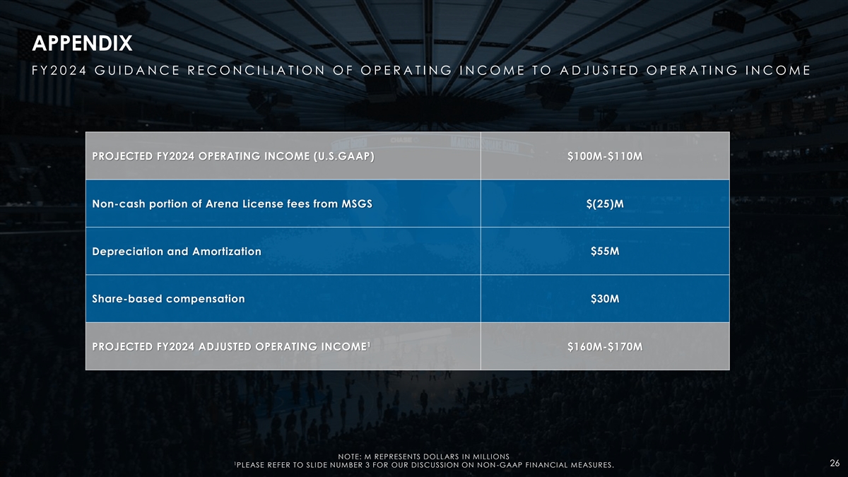 APPENDIX F Y 2 0 2 4 G U I D A N C E R E C O N C I L I A T I O N O F O P E R A T I N G I N C O M E T O A D J U S T E D O P E R A T I N G I N C O M E PROJECTED FY2024 OPERATING INCOME (U.S.GAAP) $100M-$110M Non-cash portion of Arena License fees from MSGS $(25)M Depreciation and Amortization $55M Share-based compensation $30M 1 PROJECTED FY2024 ADJUSTED OPERATING INCOME $160M-$170M NOTE: M REPRESENTS DOLLARS IN MILLIONS 1 26 PLEASE REFER TO SLIDE NUMBER 3 FOR OUR DISCUSSION ON NON -GAAP FINANCIAL MEASURES.