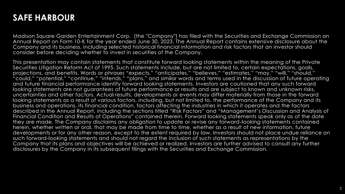 SAFE HARBOUR Madison Square Garden Entertainment Corp. (the Company ) has filed with the Securities and Exchange Commission an Annual Report on Form 10-K for the year ended June 30, 2023. The Annual Report contains extensive disclosure about the Company and its business, including selected historical financial information and risk factors that an investor should consider before deciding whether to invest in securities of the Company. This presentation may contain statements that constitute forward looking statements within the meaning of the Private Securities Litigation Reform Act of 1995. Such statements include, but are not limited to, certain expectations, goals, projections, and benefits. Words or phrases “expects,” “anticipates,” “believes,” “estimates,” “may,” “will,” “should,” “could,” “potential,” “continue,” “intends,” “plans,” and similar words and terms used in the discussion of future operating and future financial performance identify forward looking statements. Investors are cautioned that any such forward looking statements are not guarantees of future performance or results and are subject to known and unknown risks, uncertainties and other factors. Actual results, developments or events may differ materially from those in the forward looking statements as a result of various factors, including, but not limited to, the performance of the Company and its business and operations, its financial condition, factors affecting the industries in which it operates and the factors described in the Annual Report, including the sections titled “Risk Factors” and “Management’s Discussion and Analysis of Financial Condition and Results of Operations” contained therein. Forward looking statements speak only as of the date they are made. The Company disclaims any obligation to update or revise any forward-looking statements contained herein, whether written or oral, that may be made from time to time, whether as a result of new information, future developments or for any other reason, except to the extent required by law. Investors should not place undue reliance on such forward-looking statements and should not regard the inclusion of such statements as representations by the Company that its plans and objectives will be achieved or realized. Investors are further advised to consult any further disclosures by the Company in its subsequent filings with the Securities and Exchange Commission. 2