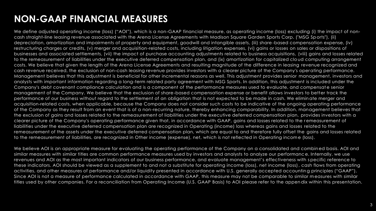 NON-GAAP FINANCIAL MEASURES We define adjusted operating income (loss) (“AOI”), which is a non-GAAP financial measure, as operating income (loss) excluding (i) the impact of non- cash straight-line leasing revenue associated with the Arena License Agreements with Madison Square Garden Sports Corp. ( MSG Sp orts ), (ii) depreciation, amortization and impairments of property and equipment, goodwill and intangible assets, (iii) share -based compensation expense, (iv) restructuring charges or credits, (v) merger and acquisition-related costs, including litigation expenses, (vi) gains or losses on sales or dispositions of businesses and associated settlements, (vii) the impact of purchase accounting adjustments related to business acquisitions, (viii) gains and losses related to the remeasurement of liabilities under the executive deferred compensation plan, and (ix) amortization for capitalized clo ud computing arrangement costs. We believe that given the length of the Arena License Agreements and resulting magnitude of the difference in leasing revenue recognized and cash revenue received, the exclusion of non-cash leasing revenue provides investors with a clearer picture of the Company's operating performance. Management believes that this adjustment is beneficial for other incremental reasons as well. This adjustment provides senior management, investors and analysts with important information regarding a long-term related party agreement with MSG Sports. In addition, this adjustment is included under the Company's debt covenant compliance calculation and is a component of the performance measures used to evaluate, and compensat e senior management of the Company. We believe that the exclusion of share-based compensation expense or benefit allows investors to better track the performance of our business without regard to the settlement of an obligation that is not expected to be made in cash. We elimin ate merger and acquisition-related costs, when applicable, because the Company does not consider such costs to be indicative of the ongoing operating performance of the Company as they result from an event that is of a non-recurring nature, thereby enhancing comparability. In addition, management believes that the exclusion of gains and losses related to the remeasurement of liabilities under the executive deferred compensation plan, provides investors with a clearer picture of the Company's operating performance given that, in accordance with GAAP, gains and losses related to the r emeasurement of liabilities under the executive deferred compensation plan are recognized in Operating (income) loss whereas gains and losses related to the remeasurement of the assets under the executive deferred compensation plan, which are equal to and therefore fully offset the gains and losses related to the remeasurement of liabilities, are recognized in Other income (expense), net, which is not reflected in Operating incom e (loss). We believe AOI is an appropriate measure for evaluating the operating performance of the Company on a consolidated and combin ed basis. AOI and similar measures with similar titles are common performance measures used by investors and analysts to analyze our performanc e. Internally, we use revenues and AOI as the most important indicators of our business performance, and evaluate management’s effectiveness with s pecific reference to these indicators. AOI should be viewed as a supplement to and not a substitute for operating income (loss), net income (loss) , cash flows from operating activities, and other measures of performance and/or liquidity presented in accordance with U.S. generally accepted accountin g principles (“GAAP”). Since AOI is not a measure of performance calculated in accordance with GAAP, this measure may not be comparable to similar m easures with similar titles used by other companies. For a reconciliation from Operating Income (U.S. GAAP Basis) to AOI please refer to the appen dix within this presentation. 3