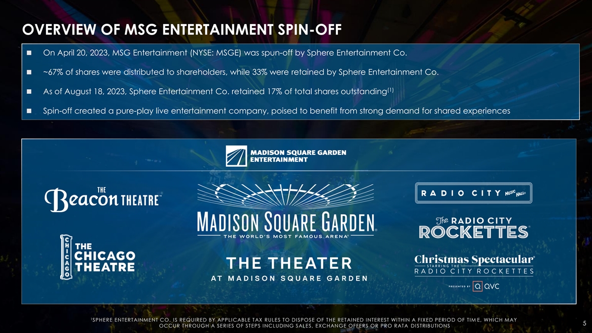 OVERVIEW OF MSG ENTERTAINMENT SPIN-OFF ◼ On April 20, 2023, MSG Entertainment (NYSE: MSGE) was spun-off by Sphere Entertainment Co. ◼ ~67% of shares were distributed to shareholders, while 33% were retained by Sphere Entertainment Co. (1) ◼ As of August 18, 2023, Sphere Entertainment Co. retained 17% of total shares outstanding ◼ Spin-off created a pure-play live entertainment company, poised to benefit from strong demand for shared experiences 1 SPHERE ENTERTAINMENT CO. IS REQUIRED BY APPLICABLE TAX RULES TO DISPOSE OF THE RETAINED INTEREST WITHIN A FIXED PERIOD OF TIM E, WHICH MAY 5 OCCUR THROUGH A SERIES OF STEPS INCLUDING SALES, EXCHANGE OFFERS OR PRO RATA DISTRIBUTIONS