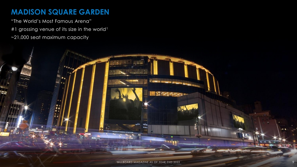 5 ICONIC VENUES ~900 LIVE EVENTS ACROSS NEW YORK AND CHICAGO IN FISCAL 2023 5.5+ MILLION GUESTS IN FISCAL 2023 35 YEAR DEALS 89 YEARS TO HOST HOME GAMES FOR OF THE CHRISTMAS SPECTACULAR NEW YORK KNICKS & RANGERS STARRING THE RADIO CITY ROCKETTES 8