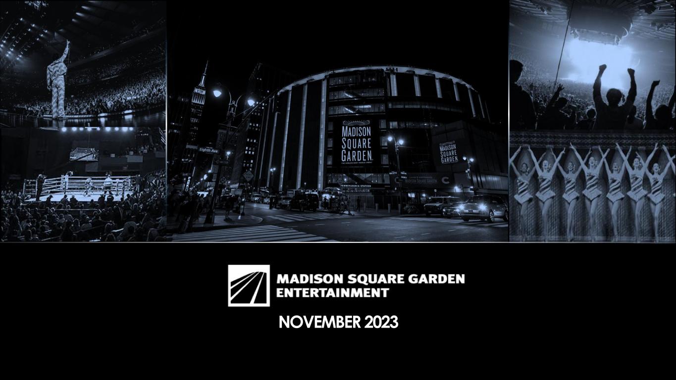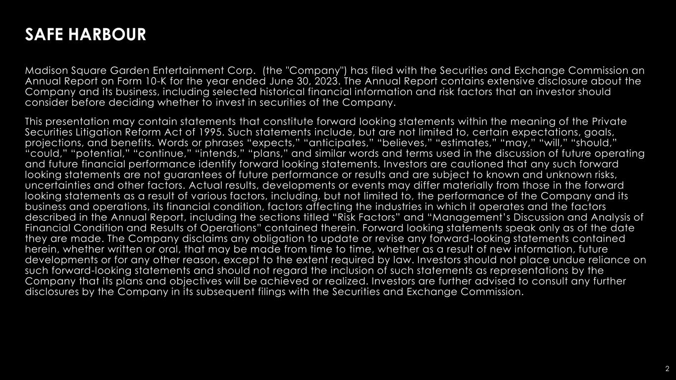 2 SAFE HARBOUR Madison Square Garden Entertainment Corp. (the "Company") has filed with the Securities and Exchange Commission an Annual Report on Form 10-K for the year ended June 30, 2023. The Annual Report contains extensive disclosure about the Company and its business, including selected historical financial information and risk factors that an investor should consider before deciding whether to invest in securities of the Company. This presentation may contain statements that constitute forward looking statements within the meaning of the Private Securities Litigation Reform Act of 1995. Such statements include, but are not limited to, certain expectations, goals, projections, and benefits. Words or phrases “expects,” “anticipates,” “believes,” “estimates,” “may,” “will,” “should,” “could,” “potential,” “continue,” “intends,” “plans,” and similar words and terms used in the discussion of future operating and future financial performance identify forward looking statements. Investors are cautioned that any such forward looking statements are not guarantees of future performance or results and are subject to known and unknown risks, uncertainties and other factors. Actual results, developments or events may differ materially from those in the forward looking statements as a result of various factors, including, but not limited to, the performance of the Company and its business and operations, its financial condition, factors affecting the industries in which it operates and the factors described in the Annual Report, including the sections titled “Risk Factors” and “Management’s Discussion and Analysis of Financial Condition and Results of Operations” contained therein. Forward looking statements speak only as of the date they are made. The Company disclaims any obligation to update or revise any forward-looking statements contained herein, whether written or oral, that may be made from time to time, whether as a result of new information, future developments or for any other reason, except to the extent required by law. Investors should not place undue reliance on such forward-looking statements and should not regard the inclusion of such statements as representations by the Company that its plans and objectives will be achieved or realized. Investors are further advised to consult any further disclosures by the Company in its subsequent filings with the Securities and Exchange Commission.