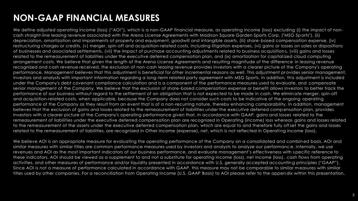 3 NON-GAAP FINANCIAL MEASURES We define adjusted operating income (loss) (“AOI”), which is a non -GAAP financial measure, as operating income (loss) excluding (i) the impact of non- cash straight-line leasing revenue associated with the Arena License Agreements with Madison Square Garden Sports Corp. ("MSG Sp orts"), (ii) depreciation, amortization and impairments of property and equipment, goodwill and intangible assets, (iii) share -based compensation expense, (iv) restructuring charges or credits, (v) merger, spin-off and acquisition-related costs, including litigation expenses, (vi) gains or losses on sales or dispositions of businesses and associated settlements, (vii) the impact of purchase accounting adjustments related to business acquisition s, (viii) gains and losses related to the remeasurement of liabilities under the executive deferred compensation plan, and (ix) amortization for capital ized cloud computing arrangement costs. We believe that given the length of the Arena License Agreements and resulting magnitude of the difference in leasing revenue recognized and cash revenue received, the exclusion of non-cash leasing revenue provides investors with a clearer picture of the Company's operating performance. Management believes that this adjustment is beneficial for other incremental reasons as well. This adjustment pr ovides senior management, investors and analysts with important information regarding a long-term related party agreement with MSG Sports. In addition, th is adjustment is included under the Company's debt covenant compliance calculation and is a component of the performance measures used to evaluate, and compensate senior management of the Company. We believe that the exclusion of share-based compensation expense or benefit allows investors to better track the performance of our business without regard to the settlement of an obligation that is not expected to be made in cash. We elimin ate merger, spin-off and acquisition-related costs, when applicable, because the Company does not consider such costs to be indicative of the ongoing operating performance of the Company as they result from an event that is of a non-recurring nature, thereby enhancing comparability. In addition, management believes that the exclusion of gains and losses related to the remeasurement of liabilities under the executive deferred comp ensation plan, provides investors with a clearer picture of the Company's operating performance given that, in accordance with GAAP, gains and losses related to the remeasurement of liabilities under the executive deferred compensation plan are recognized in Operating (income) loss whereas gains and losses related to the remeasurement of the assets under the executive deferred compensation plan, which are equal to and therefore fully off set the gains and losses related to the remeasurement of liabilities, are recognized in Other income (expense), net, which is not reflected in Operati ng income (loss). We believe AOI is an appropriate measure for evaluating the operating performance of the Company on a consolidated and combin ed basis. AOI and similar measures with similar titles are common performance measures used by investors and analysts to analyze our performanc e. Internally, we use revenues and AOI as the most important indicators of our business performance, and evaluate management’s effectiveness with s pecific reference to these indicators. AOI should be viewed as a supplement to and not a substitute for operating income (loss), net income (loss) , cash flows from operating activities, and other measures of performance and/or liquidity presented in accordance with U.S. generally accepted accountin g principles (“GAAP”). Since AOI is not a measure of performance calculated in accordance with GAAP, this measure may not be comparable to similar m easures with similar titles used by other companies. For a reconciliation from Operating Income (U.S. GAAP Basis) to AOI please refer to the appen dix within this presentation.
