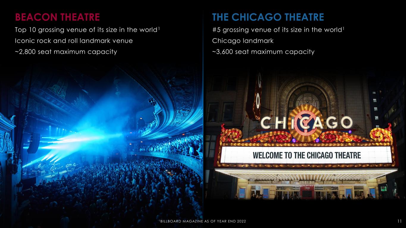 10 THE THEATER AT MADISON SQUARE GARDEN Versatile venue in central New York City location ~5,600 seat maximum capacity RADIO CITY MUSIC HALL #3 grossing venue of its size in the world1 New York City and national landmark ~6,000 seat maximum capacity 1BI LLBOARD MAGAZINE AS OF YEAR END 2022