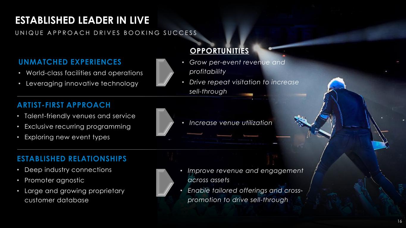 SUBSTANTIAL PRESENCE IN NEW YORK CITY METRO AREA T H E E N T E R T A I N M E N T C A P I T A L O F T H E W O R L D 15 1NEW-YORK-NEWARK (UNITED STATES CENSUS BUREAU) 2NYC & COMPANY FY22 REPORT 3FORTUNE 500 COMPANIES BY REGION REPORT 2022 4TRACKED BY NIELSEN RESEARCH 52023 POLLSTAR CONCERT MARKET RANKINGS (AS OF DECEMBER 2022) #1 CONCERT MARKET IN THE U.S.5 23 MILLION+ POPULATION1 RANKED #1 OF 210 DESIGNATED MARKET AREAS4 56 MILLION+ ANNUAL TOURISTS2 HOME TO GREATEST # OF FORTUNE 500 COMPANIES3