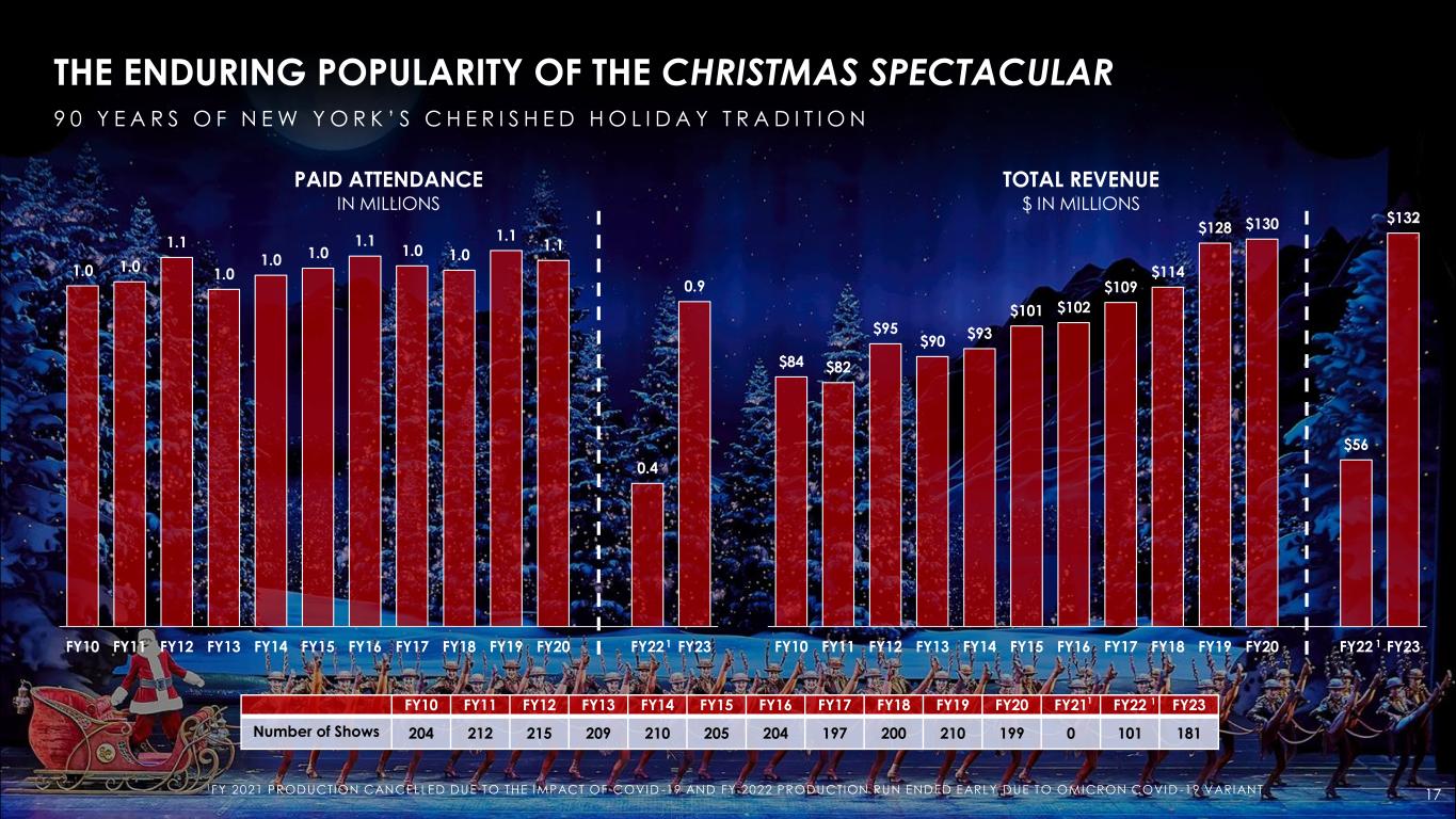 THE ENDURING POPULARITY OF THE CHRISTMAS SPECTACULAR 9 0 Y E A R S O F N E W Y O R K ’ S C H E R I S H E D H O L I D A Y T R A D I T I O N 1FY 2021 PRODUCTION CANCELLED DUE TO THE IMPACT OF COVID -19 AND FY 2022 PRODUCTION RUN ENDED EARLY DUE TO OMICRON COVID -19 VARIANT 17 FY10 FY11 FY12 FY13 FY14 FY15 FY16 FY17 FY18 FY19 FY20 FY21 FY22 FY23 Number of Shows 204 212 215 209 210 205 204 197 200 210 199 0 101 181 11 1 1.0 1.0 1.1 1.0 1.0 1.0 1.1 1.0 1.0 1.1 1.1 0.4 0.9 FY10 FY11 FY12 FY13 FY14 FY15 FY16 FY17 FY18 FY19 FY20 FY22 FY23 PAID ATTENDANCE IN MILLIONS $84 $82 $95 $90 $93 $101 $102 $109 $114 $128 $130 $56 $132 FY10 FY11 FY12 FY13 FY14 FY15 FY16 FY17 FY18 FY19 FY20 FY22 FY23 TOTAL REVENUE $ IN MILLIONS 1