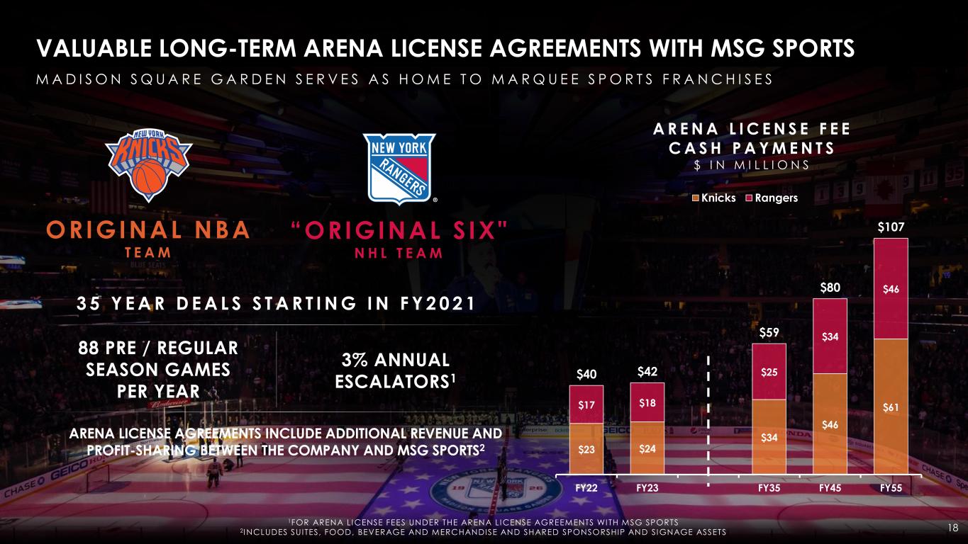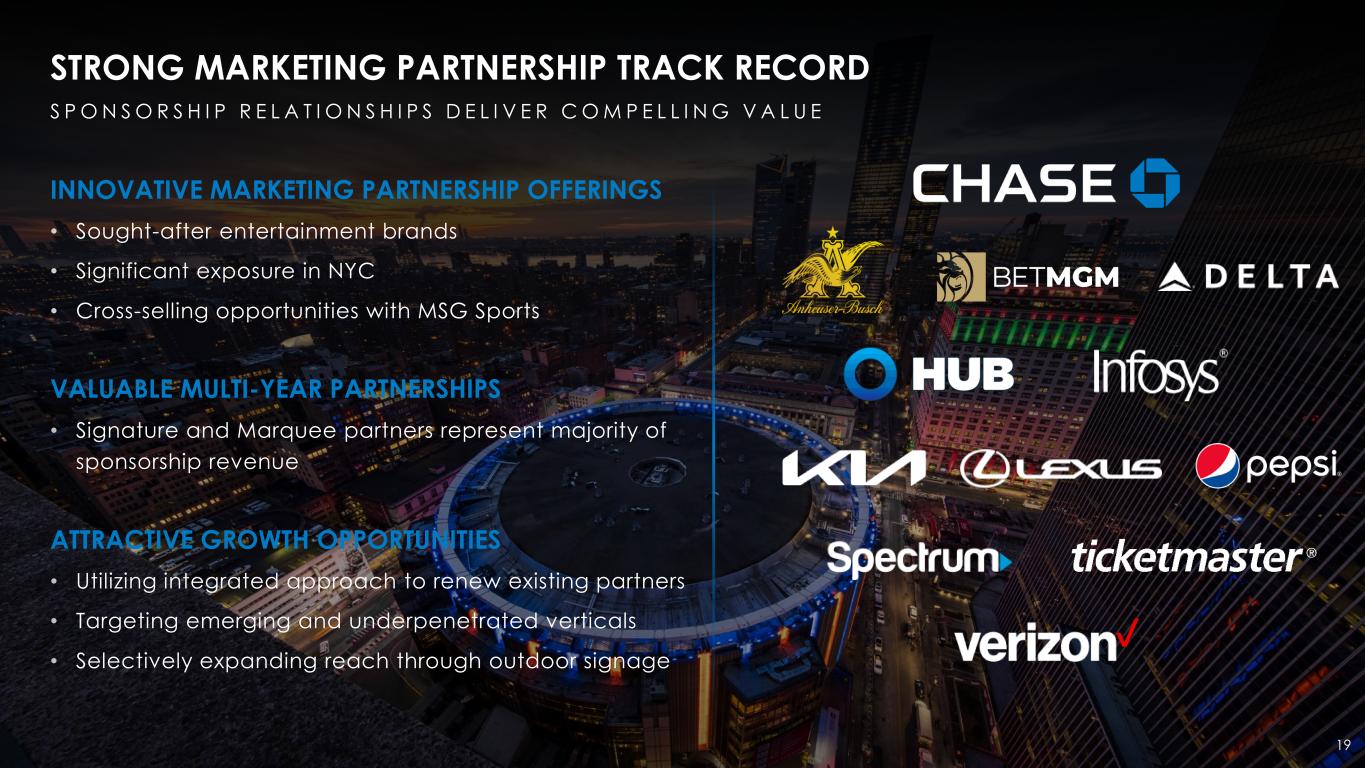 ORIGINAL NBA T E A M “ORIGINAL S IX" N H L T E A M 3 5 Y E A R D E A L S S T A R T I N G I N F Y 2 0 2 1 3% ANNUAL ESCALATORS1 88 PRE / REGULAR SEASON GAMES PER YEAR ARENA LICENSE AGREEMENTS INCLUDE ADDITIONAL REVENUE AND PROFIT-SHARING BETWEEN THE COMPANY AND MSG SPORTS2 VALUABLE LONG-TERM ARENA LICENSE AGREEMENTS WITH MSG SPORTS M A D I S O N S Q U A R E G A R D E N S E R V E S A S H O M E T O M A R Q U E E S P O R T S F R A N C H I S E S 18 1FOR ARENA LICENSE FEES UNDER THE ARENA LICENSE AGREEMENTS WITH MSG SPORTS 2INCLUDES SUITES, FOOD, BEVERAGE AND MERCHANDISE AND SHARED SPONSORSHIP AND SIGNAGE ASSETS A R E N A L I C E N S E F E E C A S H P A Y M E N T S $ I N M I L L I O N S $23 $24 $34 $46 $61 $17 $18 $25 $34 $46 $40 $42 $59 $80 $107 FY22 FY23 FY35 FY45 FY55 Knicks Rangers