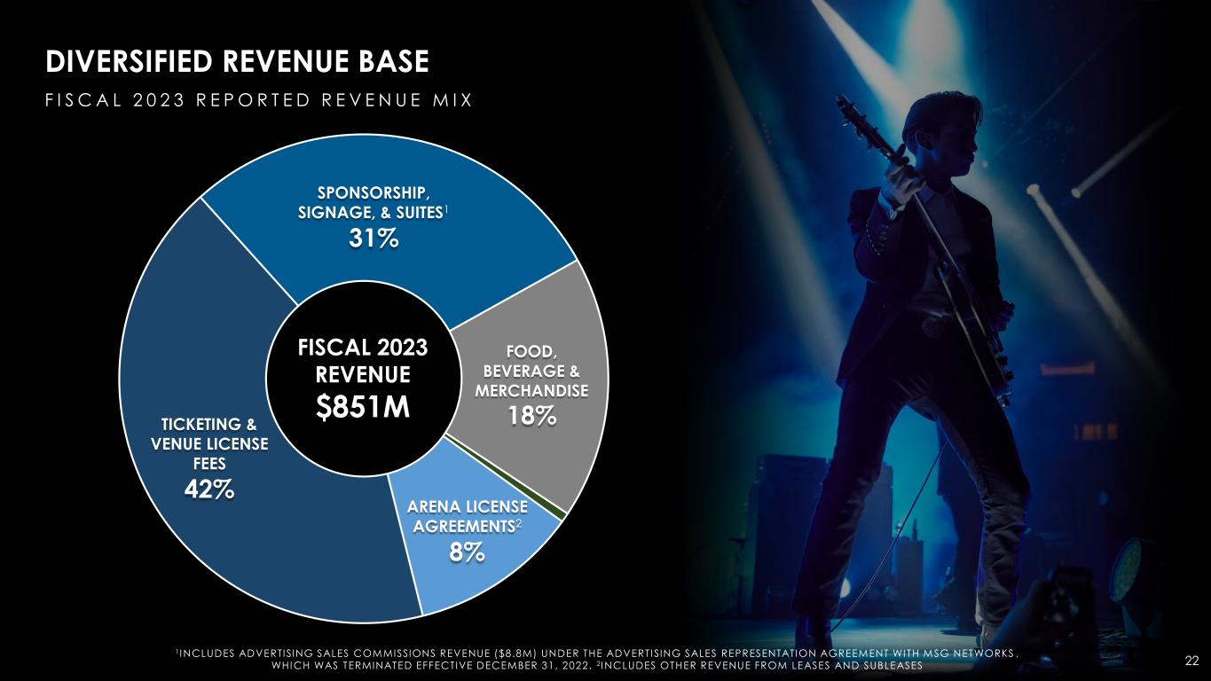 22 ARENA LICENSE AGREEMENTS2 8% SPONSORSHIP, SIGNAGE, & SUITES1 31% FOOD, BEVERAGE & MERCHANDISE 18% FISCAL 2023 REVENUE $851M 1INCLUDES ADVERTISING SALES COMMISSIONS REVENUE ($8.8M) UNDER THE ADVERTISING SALES REPRESENTATION AGREEMENT WITH MSG NETWORKS , WHICH WAS TERMINATED EFFECTIVE DECEMBER 31, 2022. 2INCLUDES OTHER REVENUE FROM LEASES AND SUBLEASES DIVERSIFIED REVENUE BASE F I S C A L 2 0 2 3 R E P O R T E D R E V E N U E M I X TICKETING & VENUE LICENSE FEES 42%