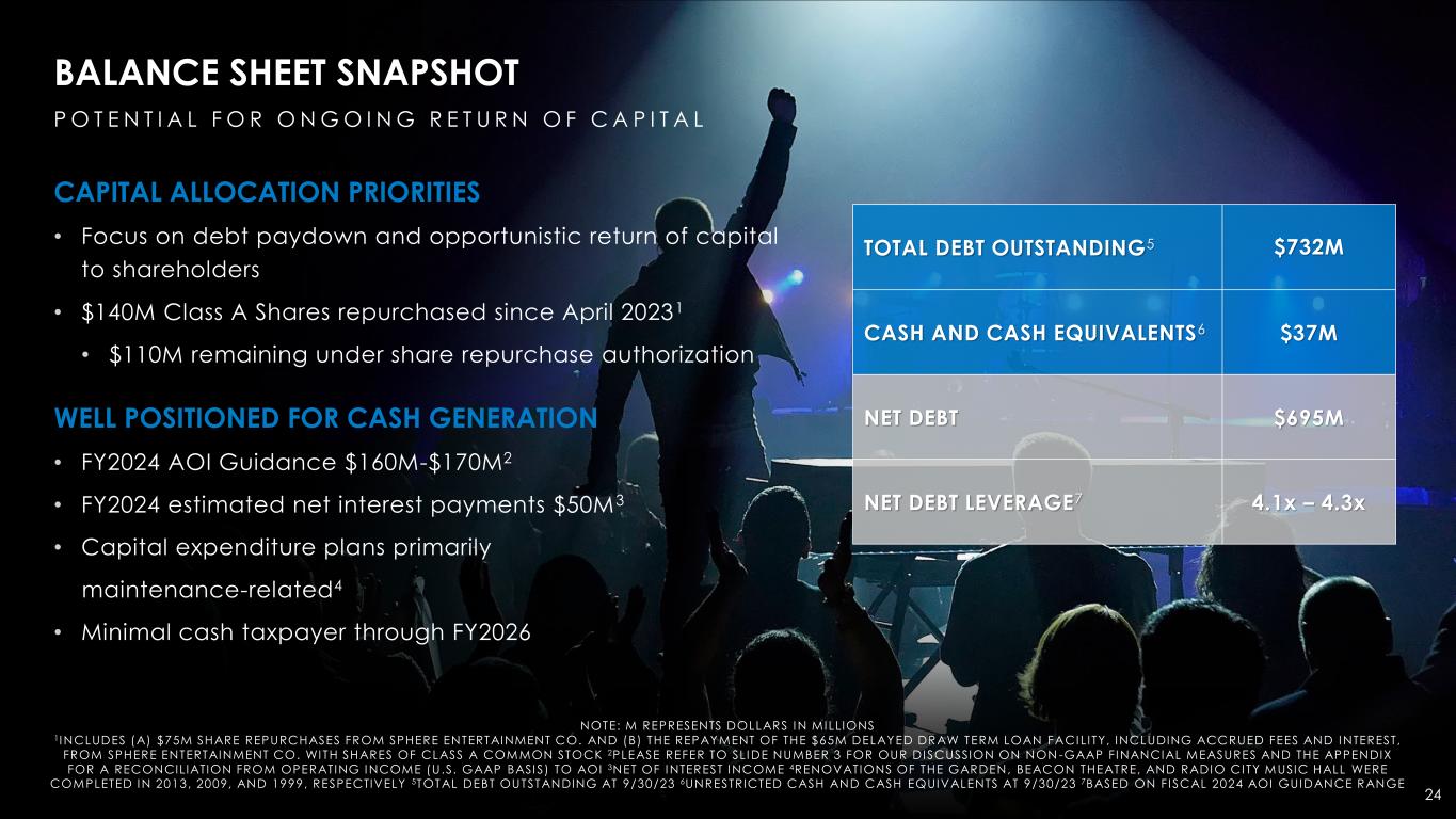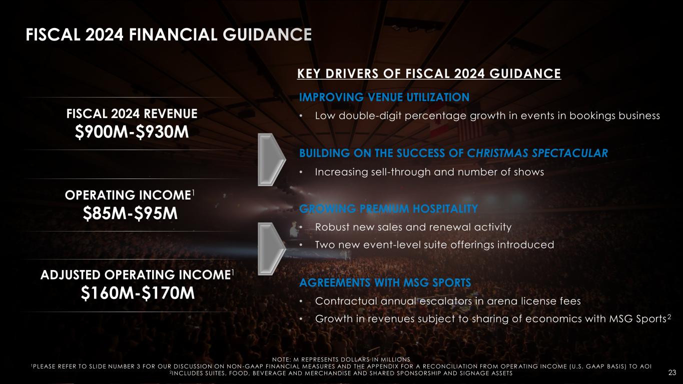 FISCAL 2024 REVENUE $900M-$930M ADJUSTED OPERATING INCOME1 $160M-$170M FISCAL 2024 FINANCIAL GUIDANCE OPERATING INCOME1 $85M-$95M 23 KEY DRIVERS OF FISCAL 2024 GUIDANCE IMPROVING VENUE UTILIZATION • Low double-digit percentage growth in events in bookings business BUILDING ON THE SUCCESS OF CHRISTMAS SPECTACULAR • Increasing sell-through and number of shows GROWING PREMIUM HOSPITALITY • Robust new sales and renewal activity • Two new event-level suite offerings introduced AGREEMENTS WITH MSG SPORTS • Contractual annual escalators in arena license fees • Growth in revenues subject to sharing of economics with MSG Sports2 NOTE: M REPRESENTS DOLLARS IN MILLIONS 1PLEASE REFER TO SLIDE NUMBER 3 FOR OUR DISCUSSION ON NON -GAAP FINANCIAL MEASURES AND THE APPENDIX FOR A RECONCILIATION FROM OPER ATING INCOME (U.S. GAAP BASIS) TO AOI 2INCLUDES SUITES, FOOD, BEVERAGE AND MERCHANDISE AND SHARED SPONSORSHIP AND SIGNAGE ASSETS