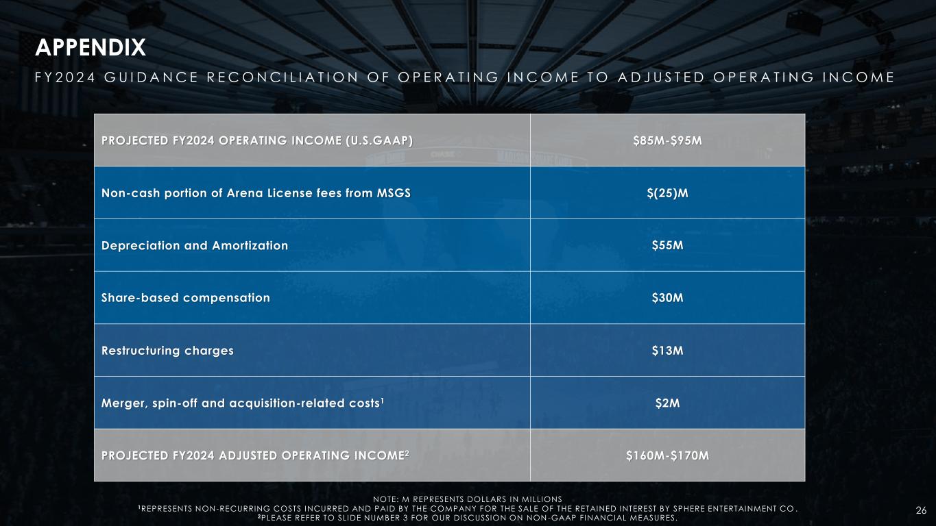 26 PROJECTED FY2024 OPERATING INCOME (U.S.GAAP) $85M-$95M Non-cash portion of Arena License fees from MSGS $(25)M Depreciation and Amortization $55M Share-based compensation $30M Restructuring charges $13M Merger, spin-off and acquisition-related costs1 $2M PROJECTED FY2024 ADJUSTED OPERATING INCOME2 $160M-$170M APPENDIX F Y 2 0 2 4 G U I D A N C E R E C O N C I L I A T I O N O F O P E R A T I N G I N C O M E T O A D J U S T E D O P E R A T I N G I N C O M E NOTE: M REPRESENTS DOLLARS IN MILLIONS 1REPRESENTS NON-RECURRING COSTS INCURRED AND PAID BY THE COMPANY FOR THE SALE OF THE RETAINED INTEREST BY SPHERE ENTERTAINMENT CO . 2PLEASE REFER TO SLIDE NUMBER 3 FOR OUR DISCUSSION ON NON -GAAP FINANCIAL MEASURES.