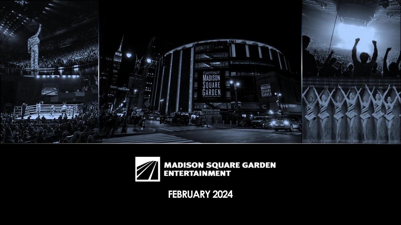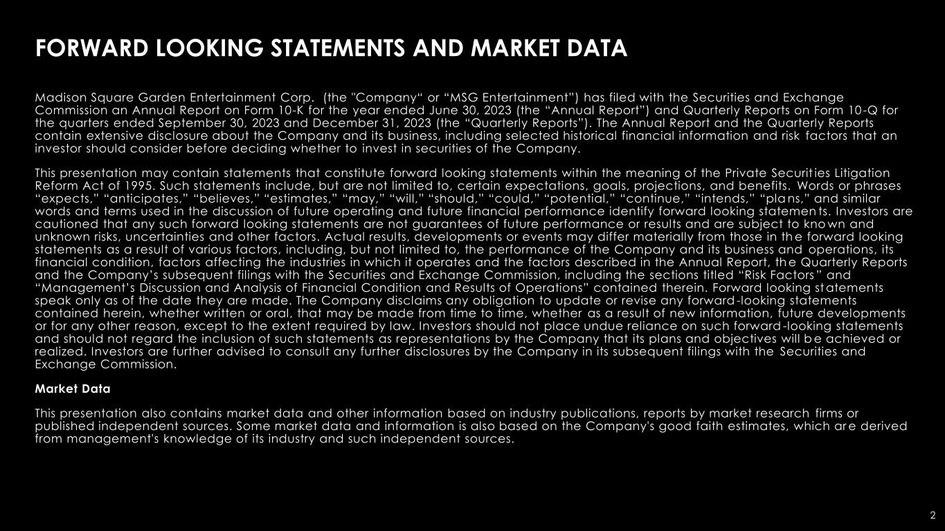 2 FORWARD LOOKING STATEMENTS AND MARKET DATA Madison Square Garden Entertainment Corp. (the "Company“ or “MSG Entertainment”) has filed with the Securities and Exchange Commission an Annual Report on Form 10-K for the year ended June 30, 2023 (the “Annual Report”) and Quarterly Reports on Form 10 -Q for the quarters ended September 30, 2023 and December 31, 2023 (the “Quarterly Reports”). The Annual Report and the Quarterly Reports contain extensive disclosure about the Company and its business, including selected historical financial information and risk factors that an investor should consider before deciding whether to invest in securities of the Company. This presentation may contain statements that constitute forward looking statements within the meaning of the Private Securit ies Litigation Reform Act of 1995. Such statements include, but are not limited to, certain expectations, goals, projections, and benefits. Words or phrases “expects,” “anticipates,” “believes,” “estimates,” “may,” “will,” “should,” “could,” “potential,” “continue,” “intends,” “pla ns,” and similar words and terms used in the discussion of future operating and future financial performance identify forward looking statemen ts. Investors are cautioned that any such forward looking statements are not guarantees of future performance or results and are subject to kno wn and unknown risks, uncertainties and other factors. Actual results, developments or events may differ materially from those in th e forward looking statements as a result of various factors, including, but not limited to, the performance of the Company and its business and operations, its financial condition, factors affecting the industries in which it operates and the factors described in the Annual Report, th e Quarterly Reports and the Company’s subsequent filings with the Securities and Exchange Commission, including the sections titled “Risk Factors ” and “Management’s Discussion and Analysis of Financial Condition and Results of Operations” contained therein. Forward looking st atements speak only as of the date they are made. The Company disclaims any obligation to update or revise any forward -looking statements contained herein, whether written or oral, that may be made from time to time, whether as a result of new information, future developments or for any other reason, except to the extent required by law. Investors should not place undue reliance on such forward -looking statements and should not regard the inclusion of such statements as representations by the Company that its plans and objectives will b e achieved or realized. Investors are further advised to consult any further disclosures by the Company in its subsequent filings with the Securities and Exchange Commission. Market Data This presentation also contains market data and other information based on industry publications, reports by market research firms or published independent sources. Some market data and information is also based on the Company's good faith estimates, which ar e derived from management's knowledge of its industry and such independent sources.