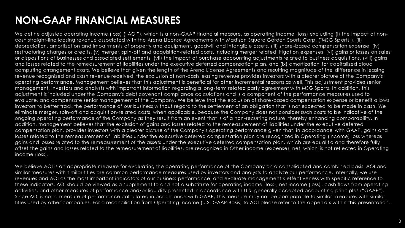 3 NON-GAAP FINANCIAL MEASURES We define adjusted operating income (loss) (“AOI”), which is a non -GAAP financial measure, as operating income (loss) excluding (i) the impact of non- cash straight-line leasing revenue associated with the Arena License Agreements with Madison Square Garden Sports Corp. ("MSG Sp orts"), (ii) depreciation, amortization and impairments of property and equipment, goodwill and intangible assets, (iii) share -based compensation expense, (iv) restructuring charges or credits, (v) merger, spin-off and acquisition-related costs, including merger related litigation expenses, (vi) gains or losses on sales or dispositions of businesses and associated settlements, (vii) the impact of purchase accounting adjustments related to busi ness acquisitions, (viii) gains and losses related to the remeasurement of liabilities under the executive deferred compensation plan, and (ix) amortization for capitalized cloud computing arrangement costs. We believe that given the length of the Arena License Agreements and resulting magnitude of the difference in leasing revenue recognized and cash revenue received, the exclusion of non-cash leasing revenue provides investors with a clearer picture of the Company's operating performance. Management believes that this adjustment is beneficial for other incremental reasons as well. This adj ustment provides senior management, investors and analysts with important information regarding a long-term related party agreement with MSG Sports. In addition, this adjustment is included under the Company's debt covenant compliance calculations and is a component of the performance measur es used to evaluate, and compensate senior management of the Company. We believe that the exclusion of share -based compensation expense or benefit allows investors to better track the performance of our business without regard to the settlement of an obligation that is not expected to be made in cash. We eliminate merger, spin-off and acquisition-related costs, when applicable, because the Company does not consider such costs to be indicative of the ongoing operating performance of the Company as they result from an event that is of a non-recurring nature, thereby enhancing comparability. In addition, management believes that the exclusion of gains and losses related to the remeasurement of liabilities under the ex ecutive deferred compensation plan, provides investors with a clearer picture of the Company's operating performance given that, in accordance with GAAP, gains and losses related to the remeasurement of liabilities under the executive deferred compensation plan are recognized in Operating (income) loss whereas gains and losses related to the remeasurement of the assets under the executive deferred compensation plan, which are equal t o and therefore fully offset the gains and losses related to the remeasurement of liabilities, are recognized in Other income (expense), net, which is not reflected in Operating income (loss). We believe AOI is an appropriate measure for evaluating the operating performance of the Company on a consolidated and combin ed basis. AOI and similar measures with similar titles are common performance measures used by investors and analysts to analyze our performanc e. Internally, we use revenues and AOI as the most important indicators of our business performance, and evaluate management’s effectiveness with specific reference to these indicators. AOI should be viewed as a supplement to and not a substitute for operating income (loss), net income (loss) , cash flows from operating activities, and other measures of performance and/or liquidity presented in accordance with U.S. generally accepted accountin g principles (“GAAP”). Since AOI is not a measure of performance calculated in accordance with GAAP, this measure may not be comparable to similar m easures with similar titles used by other companies. For a reconciliation from Operating Income (U.S. GAAP Basis) to AOI please refer to the appen dix within this presentation.