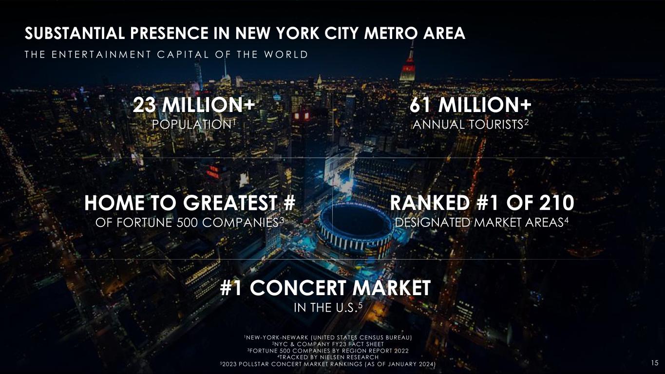 SUBSTANTIAL PRESENCE IN NEW YORK CITY METRO AREA T H E E N T E R T A I N M E N T C A P I T A L O F T H E W O R L D 15 1NEW-YORK-NEWARK (UNITED STATES CENSUS BUREAU) 2NYC & COMPANY FY23 FACT SHEET 3FORTUNE 500 COMPANIES BY REGION REPORT 2022 4TRACKED BY NIELSEN RESEARCH 52023 POLLSTAR CONCERT MARKET RANKINGS (AS OF JANUARY 2024) #1 CONCERT MARKET IN THE U.S.5 23 MILLION+ POPULATION1 RANKED #1 OF 210 DESIGNATED MARKET AREAS4 61 MILLION+ ANNUAL TOURISTS2 HOME TO GREATEST # OF FORTUNE 500 COMPANIES3