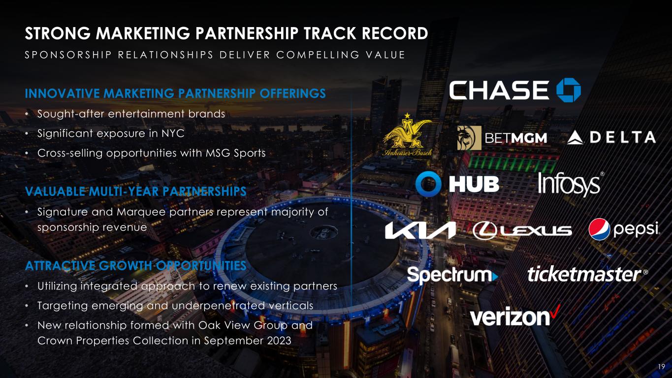ORIGINAL NBA T E A M “ORIGINAL S IX" N H L T E A M 3 5 Y E A R D E A L S S T A R T I N G I N F Y 2 0 2 1 3% ANNUAL ESCALATORS1 88 PRE / REGULAR SEASON GAMES PER YEAR ARENA LICENSE AGREEMENTS INCLUDE ADDITIONAL REVENUE AND PROFIT-SHARING BETWEEN THE COMPANY AND MSG SPORTS2 VALUABLE LONG-TERM ARENA LICENSE AGREEMENTS WITH MSG SPORTS M A D I S O N S Q U A R E G A R D E N S E R V E S A S H O M E T O M A R Q U E E S P O R T S F R A N C H I S E S 18 1FOR ARENA LICENSE FEES UNDER THE ARENA LICENSE AGREEMENTS WITH MSG SPORTS 2INCLUDES SUITES, FOOD, BEVERAGE AND MERCHANDISE AND SHARED SPONSORSHIP AND SIGNAGE ASSETS A R E N A L I C E N S E F E E C A S H P A Y M E N T S $ I N M I L L I O N S $23 $24 $34 $46 $61 $17 $18 $25 $34 $46 $40 $42 $59 $80 $107 FY22 FY23 FY35 FY45 FY55 Knicks Rangers